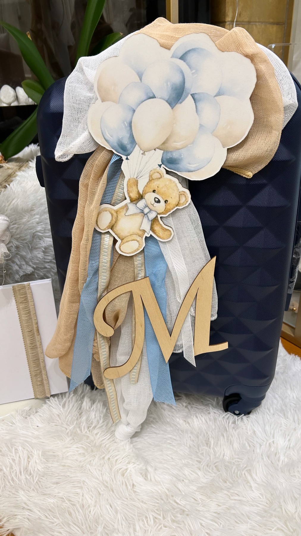 Ολοκληρωμένο πακέτο βάπτισης με θέμα Αρκουδάκι. Το πακέτο περιλαμβάνει τροχήλατη βαλίτσα, λαδόπανα, 3 κεράκια κολυμπήθρας, σαπουνάκι, μπουκαλάκι λαδιού, 50 μαρτυρικά και το βιβλίο ευχών. Επίσης περιέχει το ρούχο και παπούτσι της επιλογησ σας .