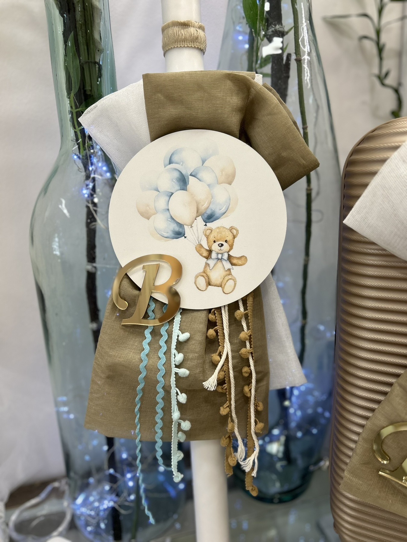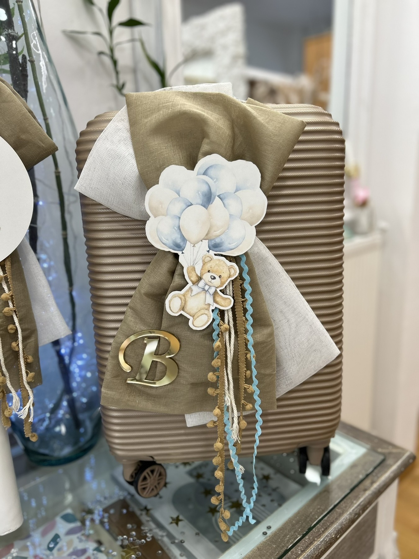 Ολοκληρωμένο πακέτο βάπτισης με θέμα αρκουδάκι με μπαλόνια και μονόγραμμα. Το πακέτο περιλαμβάνει τροχήλατη βαλίτσα, λαδόπανα, 3 κεράκια κολυμπήθρας, σαπουνάκι, μπουκαλάκι λαδιού και 50 μαρτυρικά.