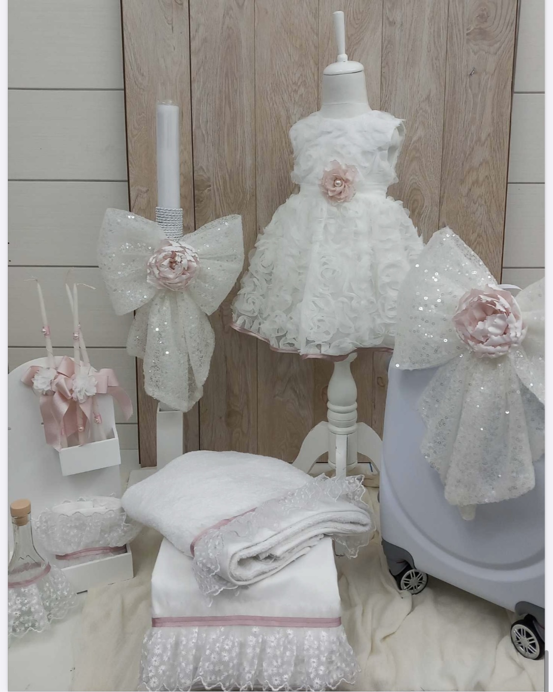 Ολοκληρωμένο πακέτο βάπτισης για κορίτσια. Το πακέτο περιλαμβάνει τροχήλατη βαλίτσα, λαδόπανα, 3 κεράκια κολυμπήθρας, σαπουνάκι, μπουκαλάκι λαδιού, 50 μαρτυρικά και καλτσούλες.