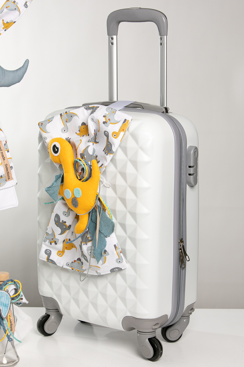 Ολοκληρωμένο πακέτο βάπτισης με θέμα δεινόσαυρος. Το πακέτο περιλαμβάνει τροχήλατη βαλίτσα, λαδόπανα, 3 κεράκια κολυμπήθρας, σαπουνάκι, μπουκαλάκι λαδιού και 50 μαρτυρικά.
