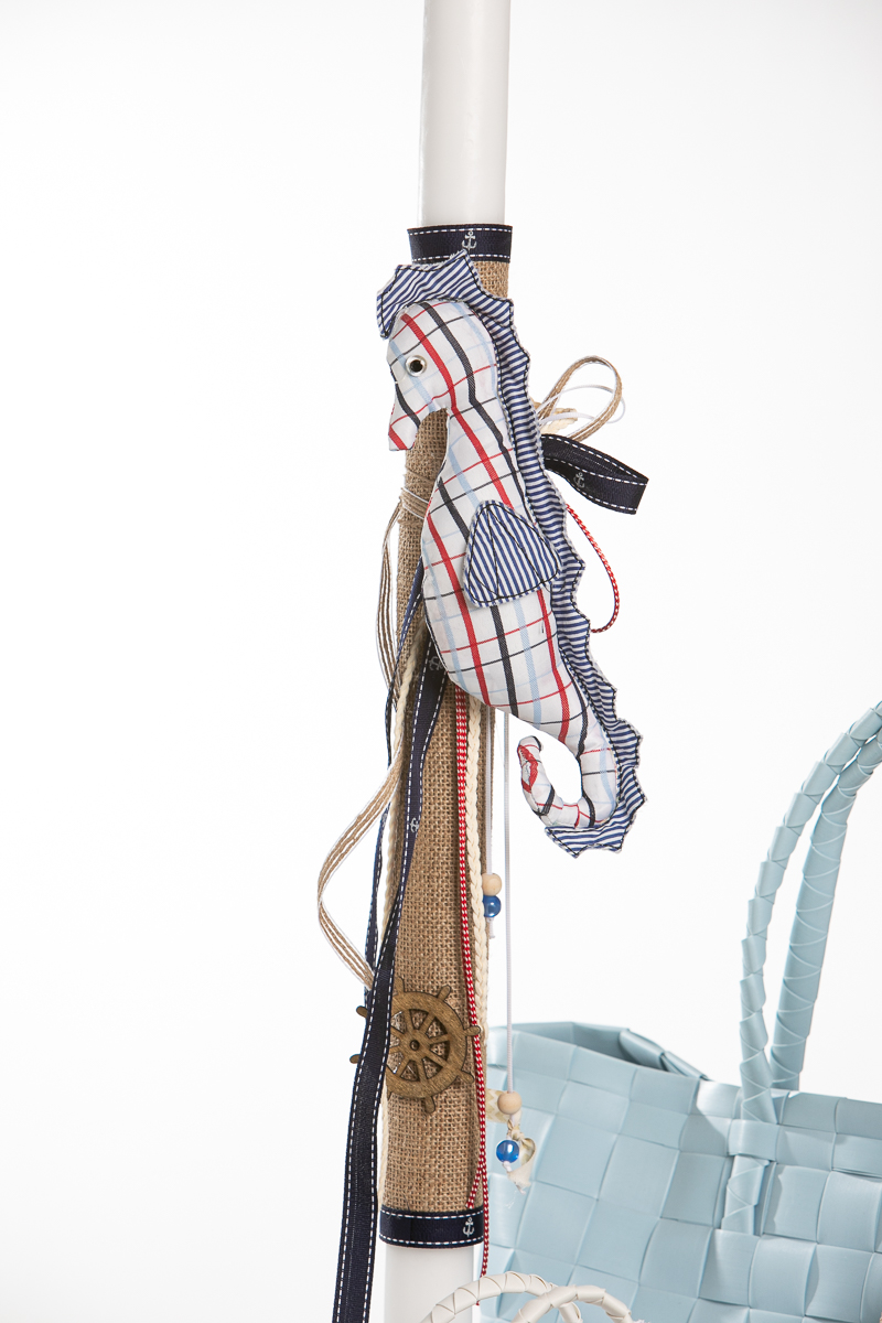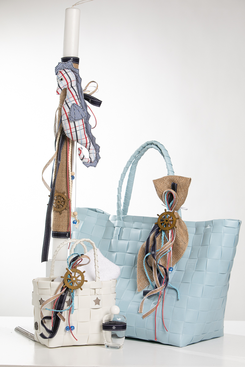 Ολοκληρωμένο πακέτο βάπτισης με θέμα ιππόκαμπος. Το πακέτο περιλαμβάνει τσάντα, λαδόπανα, 3 κεράκια κολυμπήθρας, σαπουνάκι, μπουκαλάκι λαδιού και 50 μαρτυρικά.