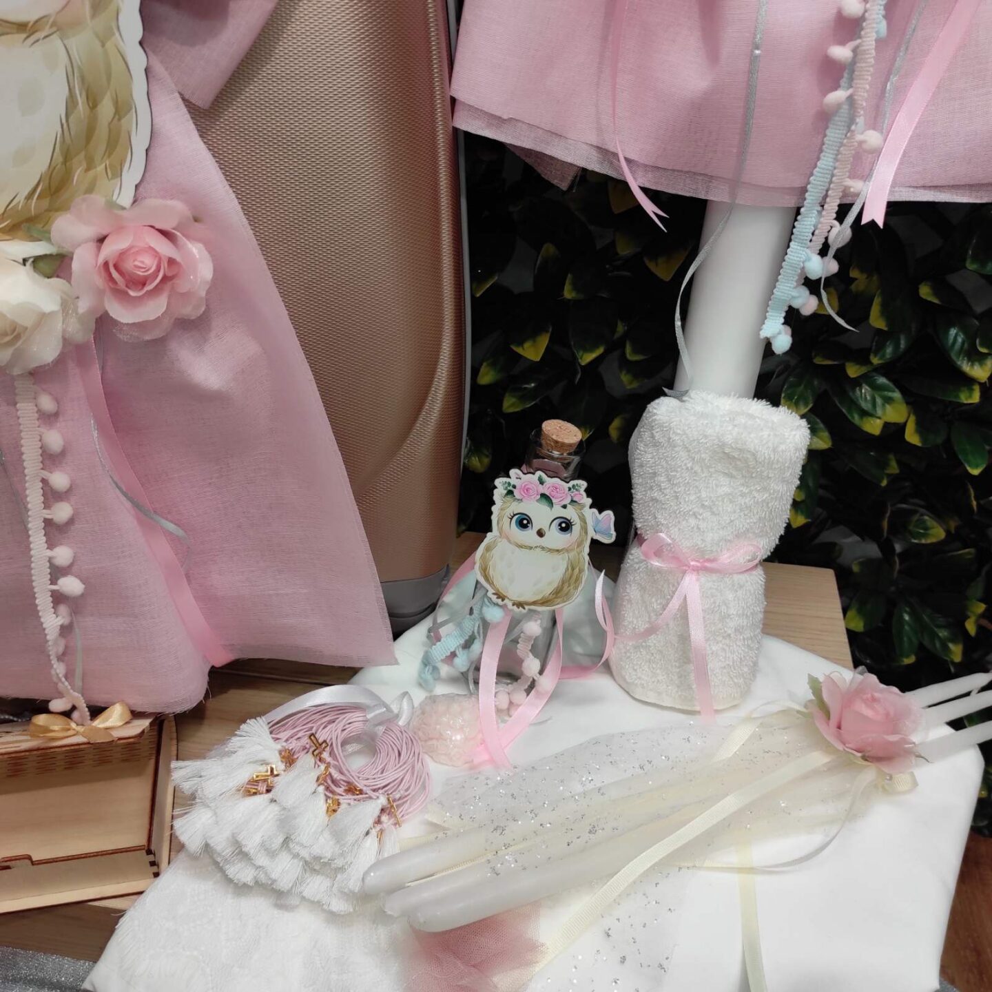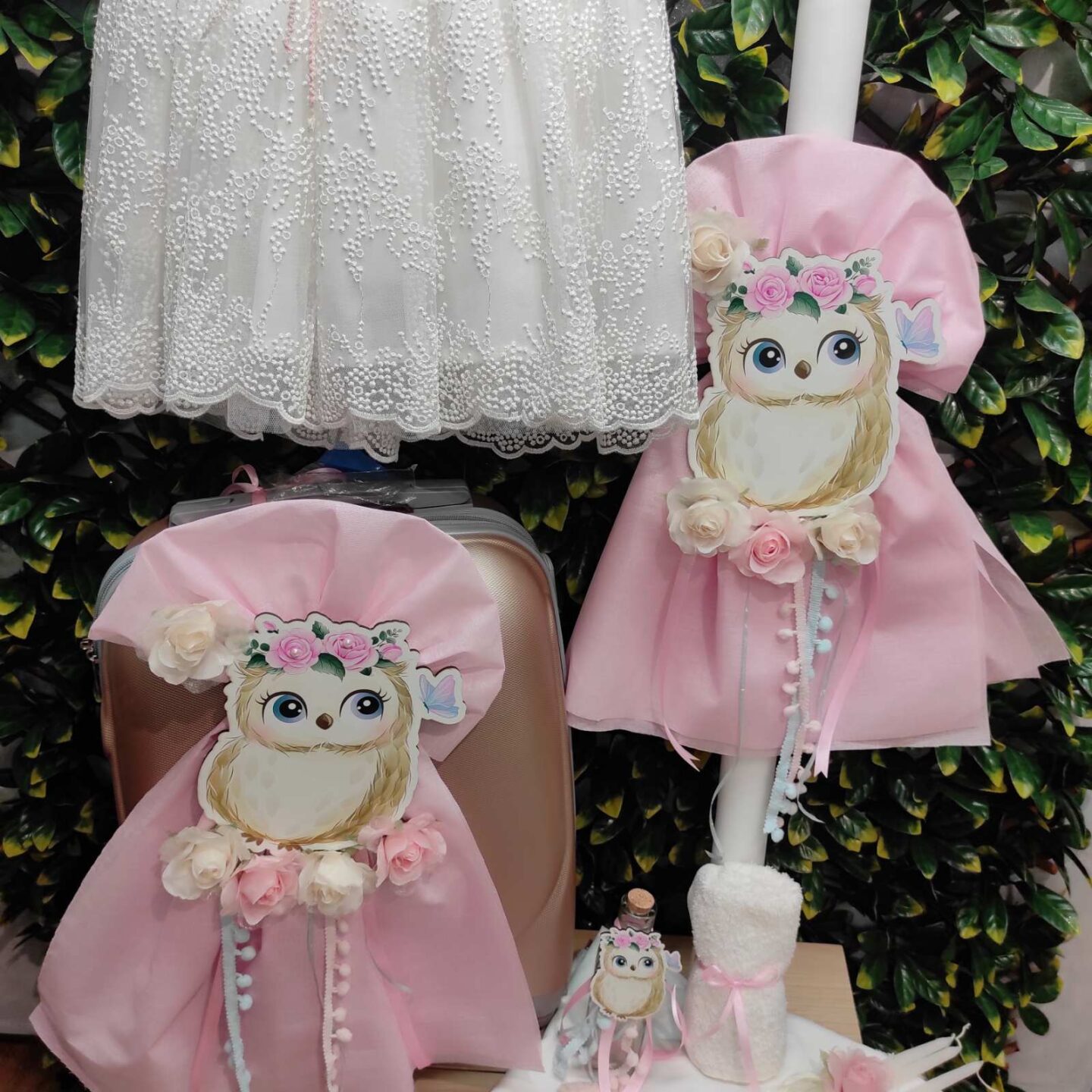 Ολοκληρωμένο πακέτο βάπτισης με θέμα κουκουβάγια. Το πακέτο περιλαμβάνει τροχήλατη βαλίτσα, λαδόπανα, 3 κεράκια κολυμπήθρας, σαπουνάκι, μπουκαλάκι λαδιού, 50 μαρτυρικά και καλτσούλες.