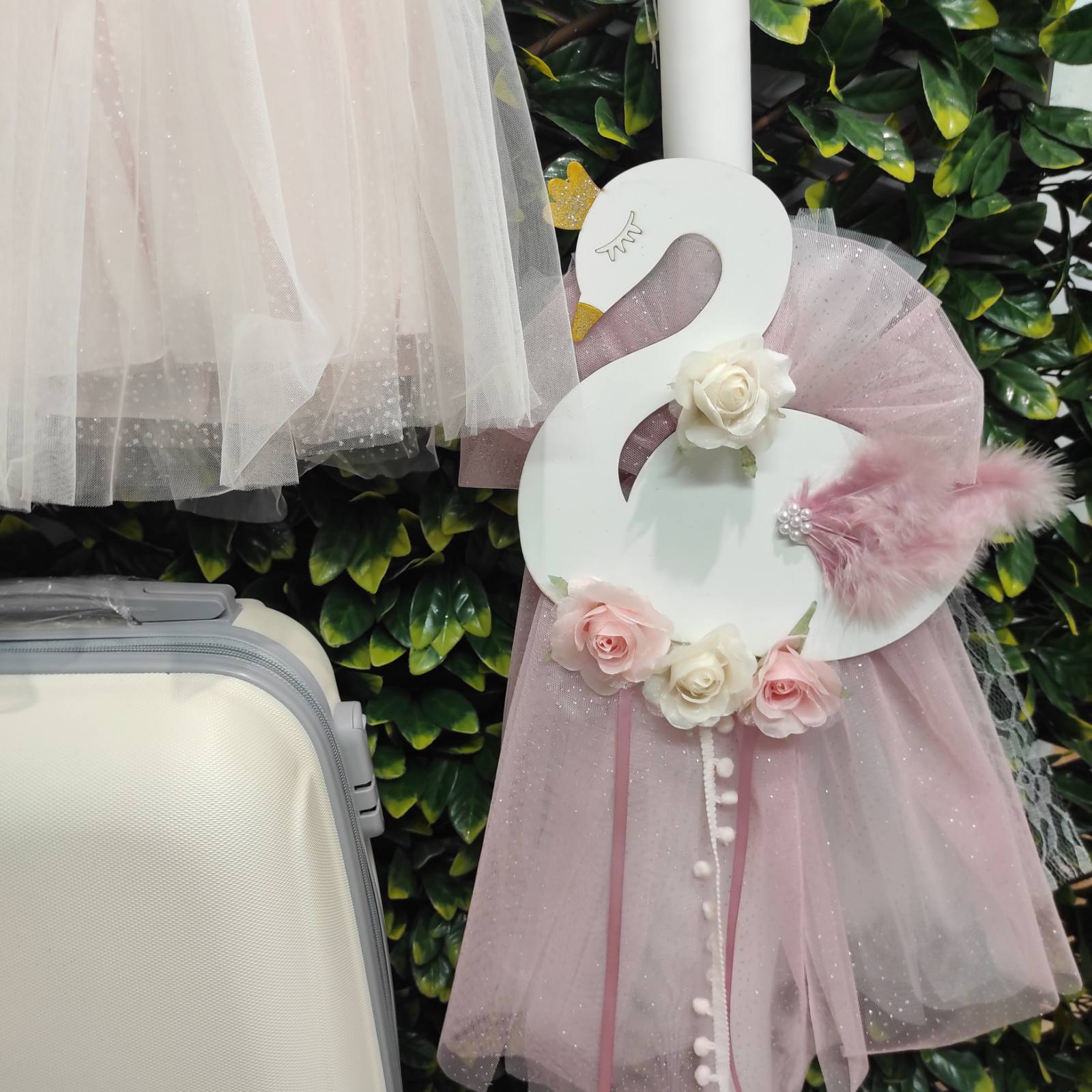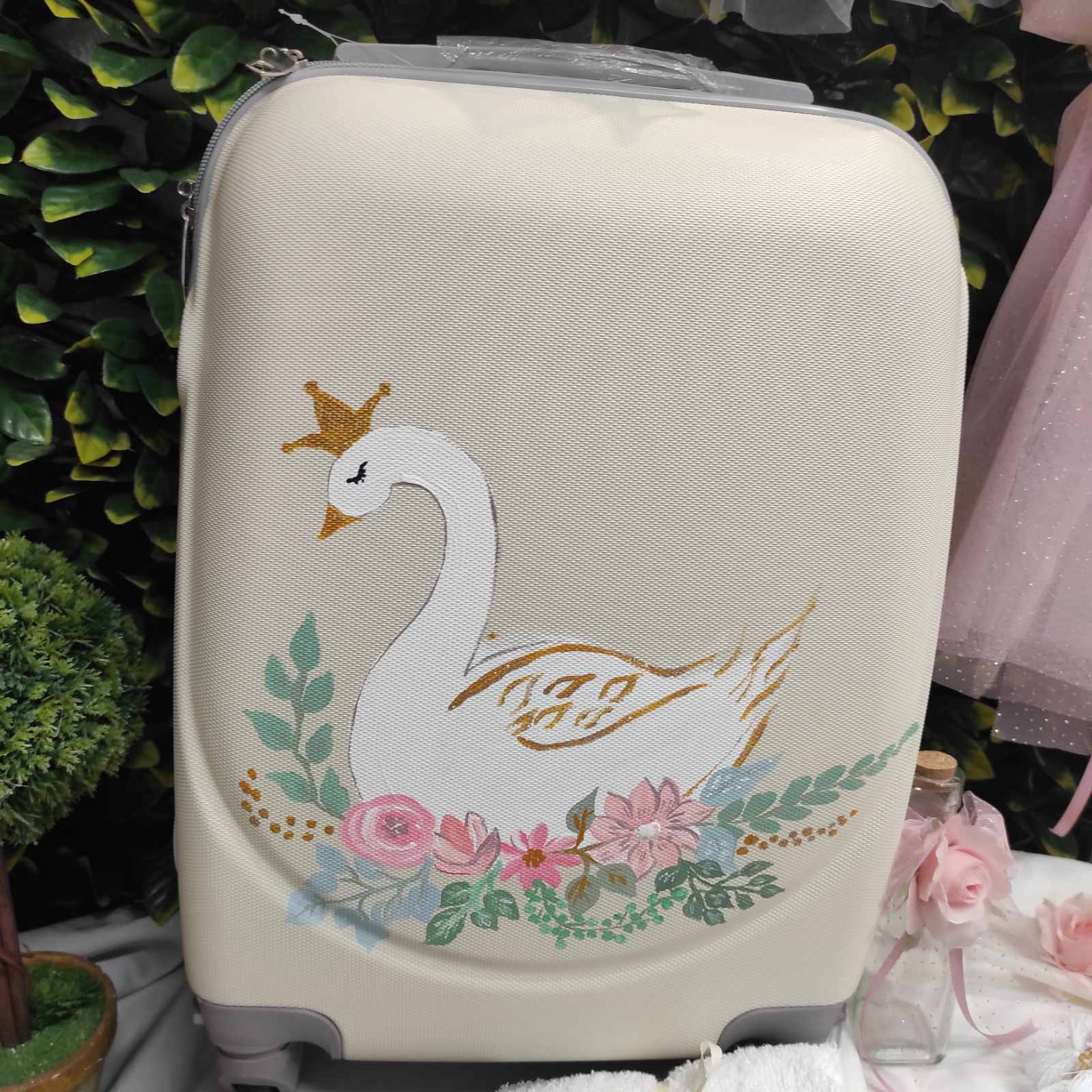 Ολοκληρωμένο πακέτο βάπτισης με κύκνος, ζωγραφισμένο στο χέρι. Το πακέτο περιλαμβάνει τροχήλατη βαλίτσα, λαδόπανα, 3 κεράκια κολυμπήθρας, σαπουνάκι, μπουκαλάκι λαδιού και 50 μαρτυρικά.