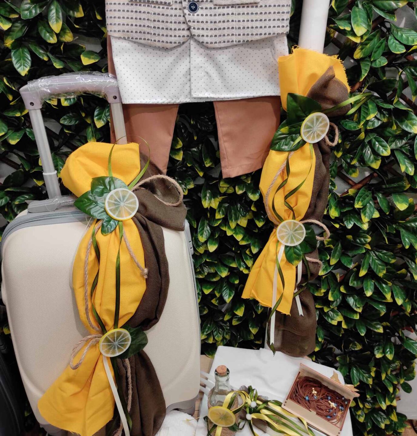 Ολοκληρωμένο πακέτο βάπτισης με θέμα λεμόνι. Το πακέτο περιλαμβάνει τροχήλατη βαλίτσα, λαδόπανα, 3 κεράκια κολυμπήθρας, σαπουνάκι, μπουκαλάκι λαδιού, 50 μαρτυρικά και καλτσούλες.