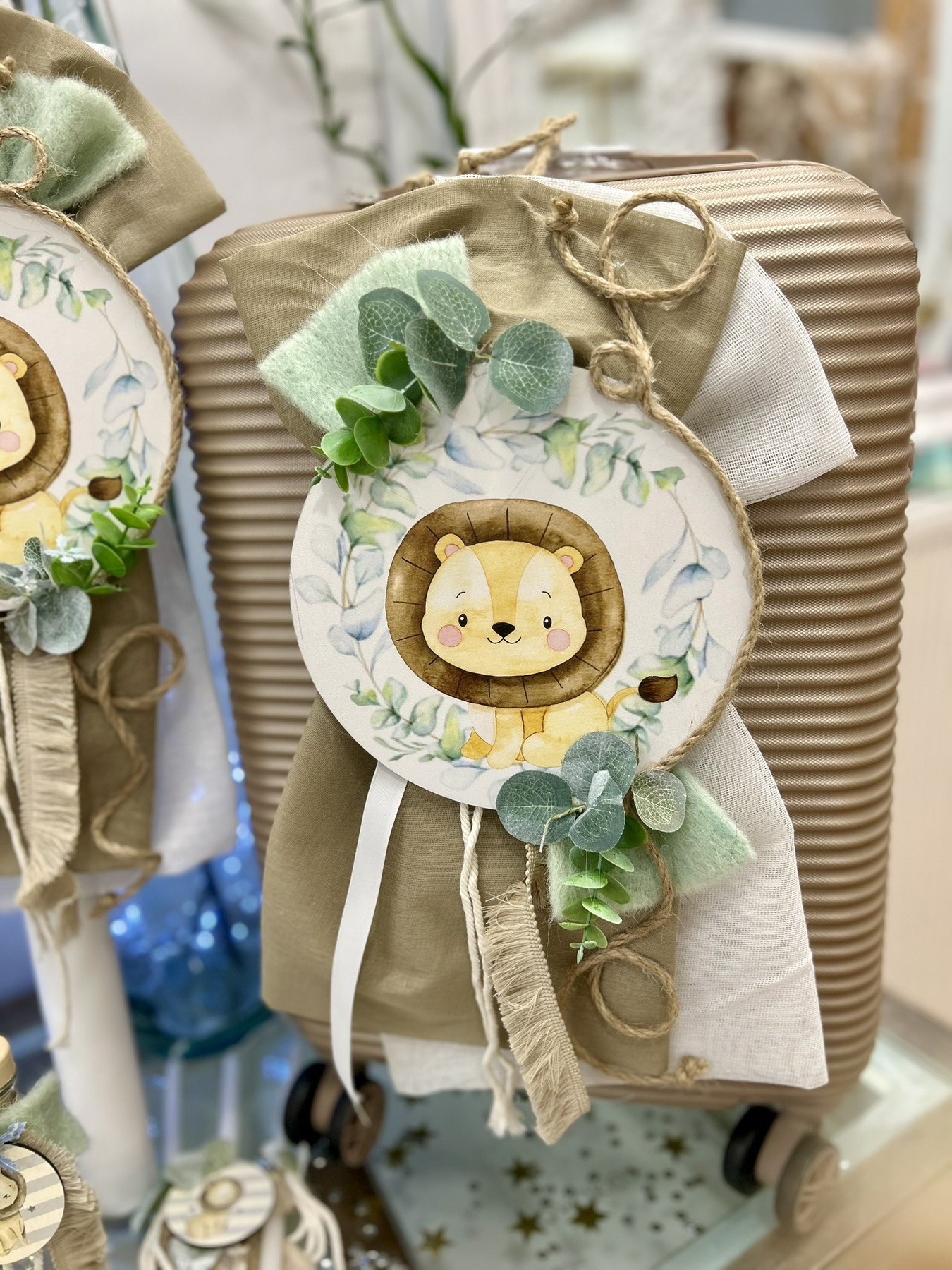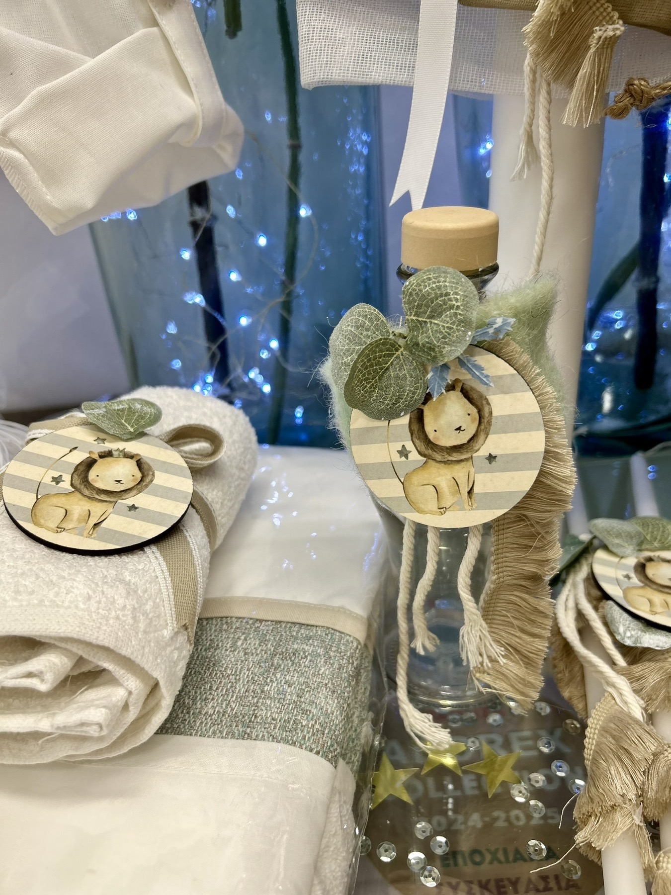Ολοκληρωμένο πακέτο βάπτισης με θέμα Λιονταράκι. Το πακέτο περιλαμβάνει τροχήλατη βαλίτσα, λαδόπανα, 3 κεράκια κολυμπήθρας, σαπουνάκι, μπουκαλάκι λαδιού και 50 μαρτυρικά. Επίσης περιέχει το ρούχο και παπούτσι της επιλογησ σας (για το συγκεκριμένο ρούχο και παπούτσι να προηγηθεί τηλεφωνική επικοινωνία ).