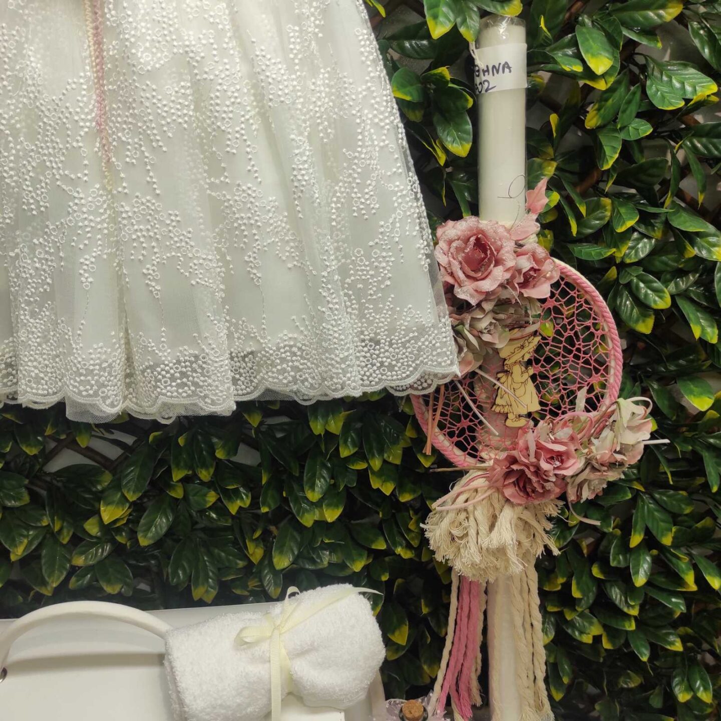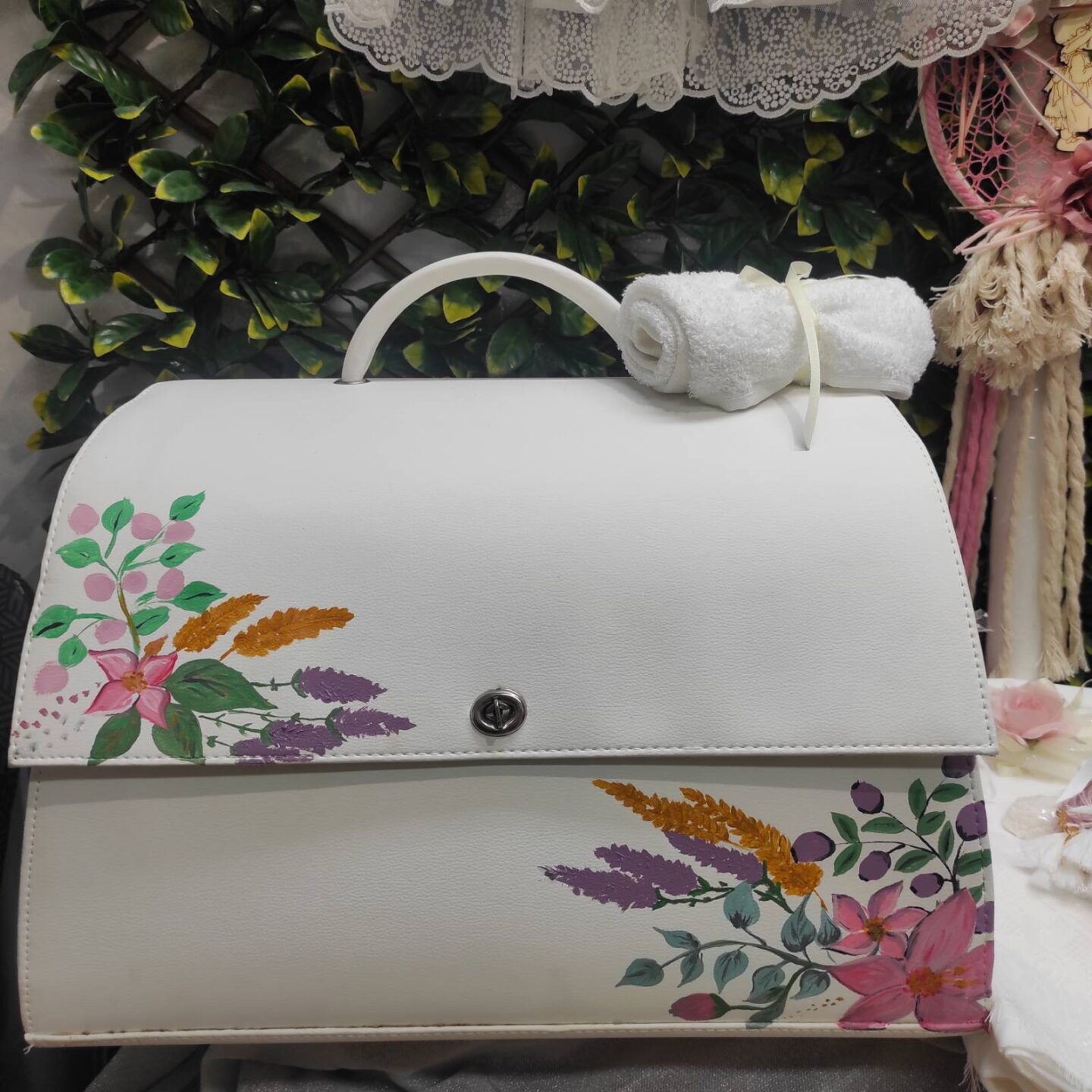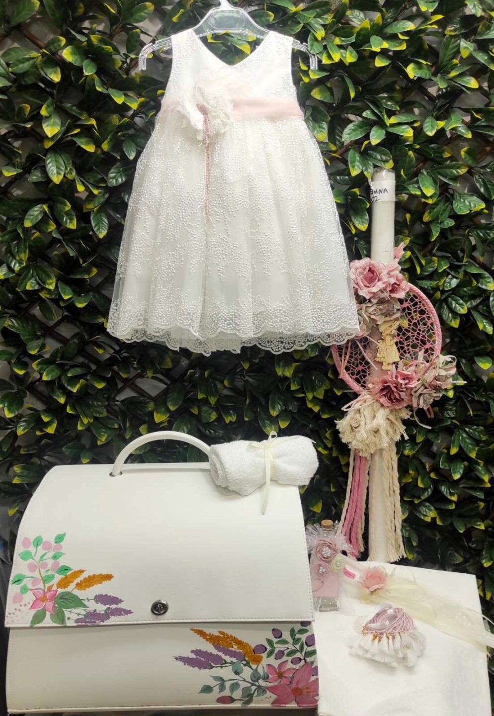 Ολοκληρωμένο πακέτο βάπτισης με θέμα λουλούδια, ζωγραφισμένο στο χέρι. Το πακέτο περιλαμβάνει δερμάτινη βαλίτσα, λαδόπανα, 3 κεράκια κολυμπήθρας, σαπουνάκι, μπουκαλάκι λαδιού, 50 μαρτυρικά και καλτσούλες.