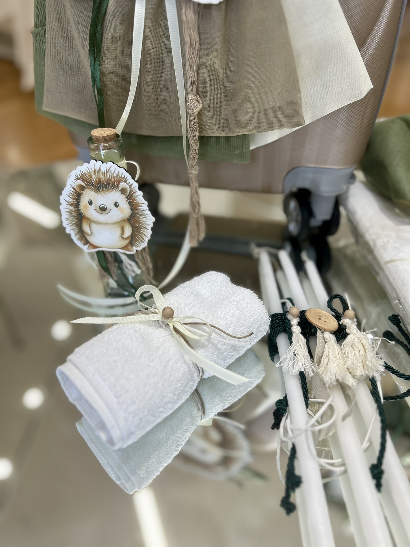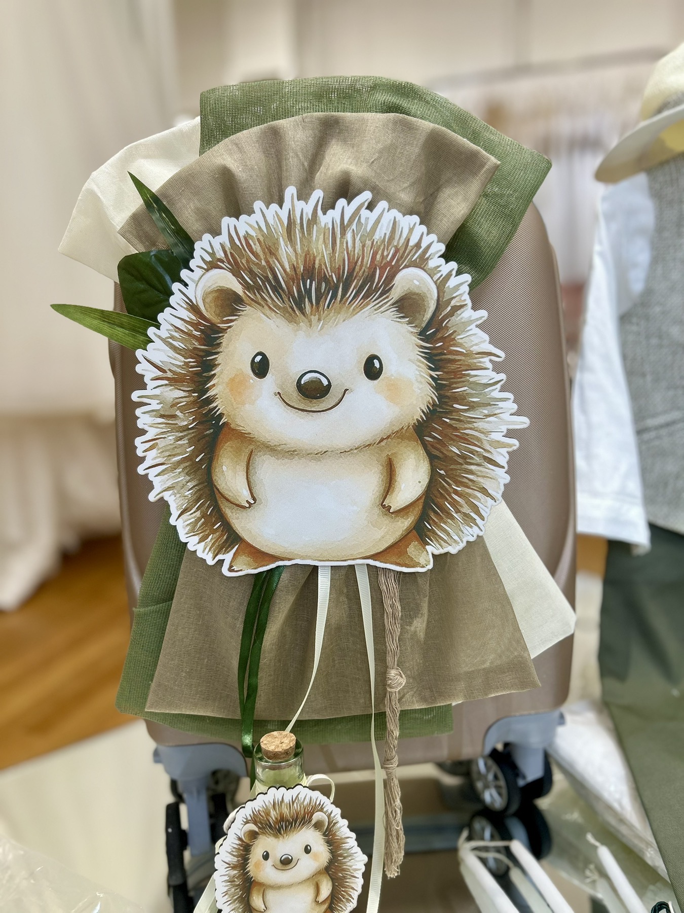 Ολοκληρωμένο πακέτο βάπτισης με θέμα Σκαντζόχοιρος. Το πακέτο περιλαμβάνει τροχήλατη βαλίτσα, λαδόπανα, 3 κεράκια κολυμπήθρας, σαπουνάκι, μπουκαλάκι λαδιού και 50 μαρτυρικά. Επίσης περιέχει το ρούχο και παπούτσι της επιλογησ σας .