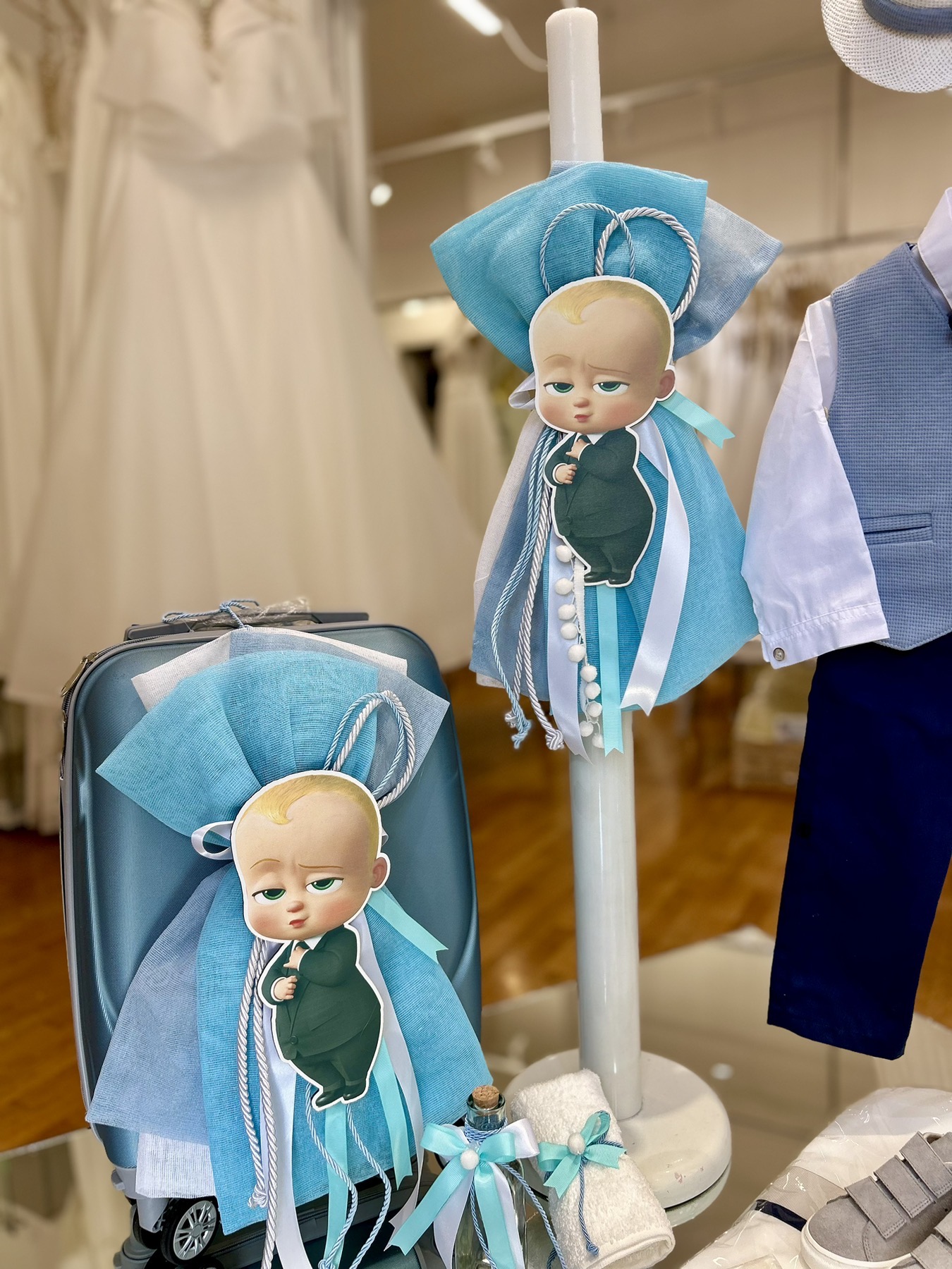 Ολοκληρωμένο πακέτο βάπτισης με θέμα Baby boss.Το πακέτο περιλαμβάνει τροχήλατη βαλίτσα, λαδόπανα, 3 κεράκια κολυμπήθρας, σαπουνάκι, μπουκαλάκι λαδιού και 50 μαρτυρικά. Επίσης περιέχει το ρούχο και παπούτσι της επιλογησ σας .