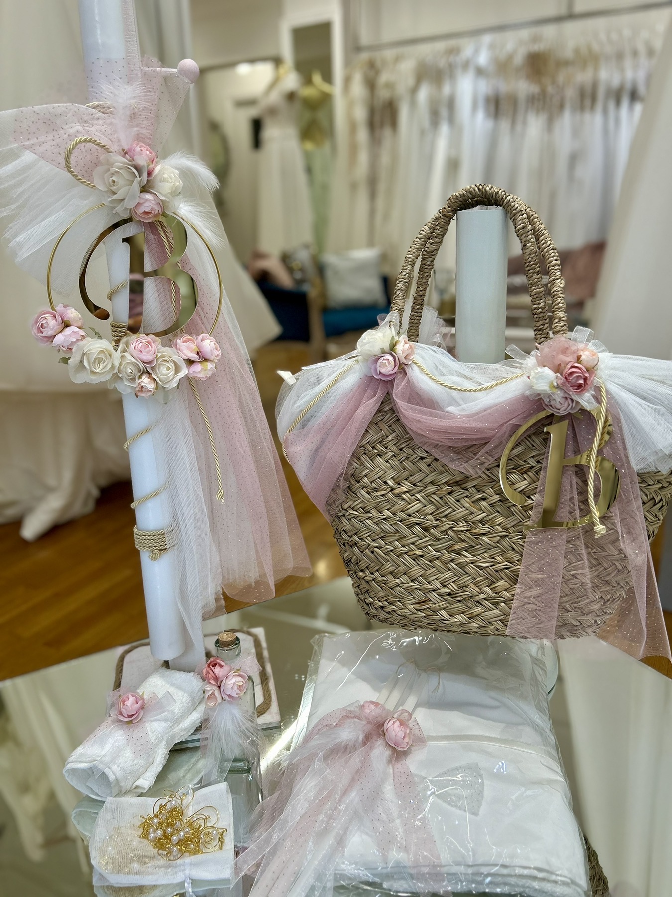 Ολοκληρωμένο πακέτο βάπτισης με ψάθινη τσάντα σε ρομαντικό στιλ. Το πακέτο περιλαμβάνει ψάθινη τσάντα , λαδόπανα, 3 κεράκια κολυμπήθρας, σαπουνάκι, μπουκαλάκι λαδιού, 50 μαρτυρικά και καλτσούλες. Επίσης περιέχει το ρούχο και παπούτσι της επιλογησ σας