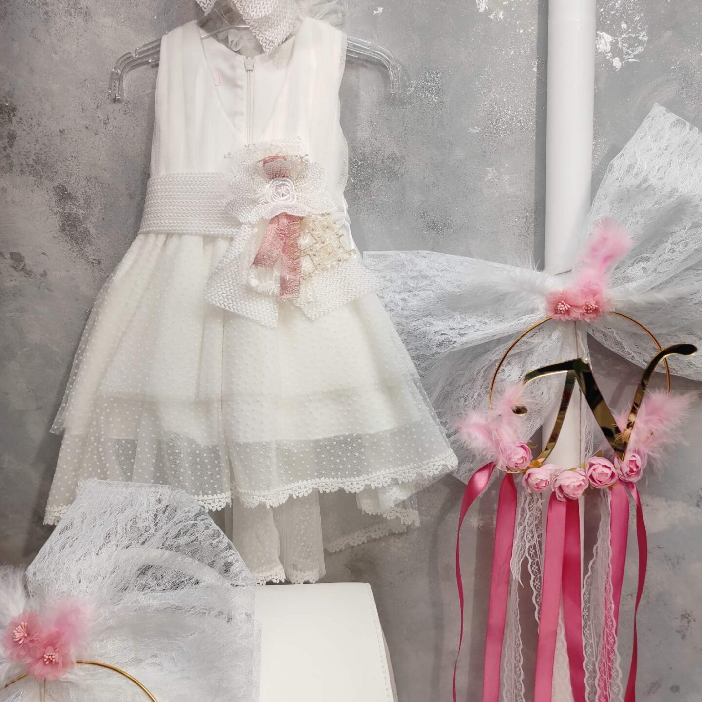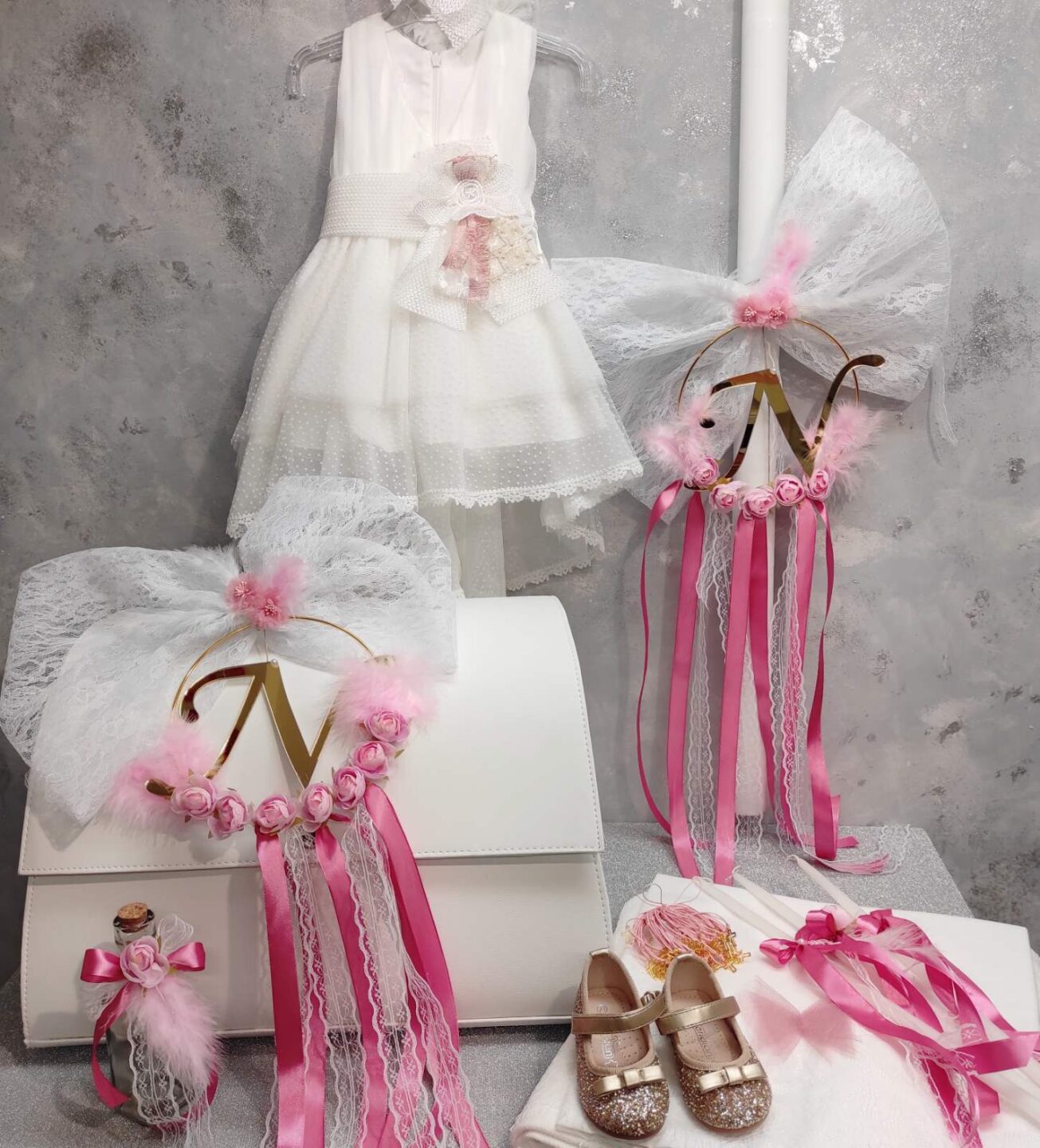 Ολοκληρωμένο πακέτο βάπτισης μονόγραμμα. Το πακέτο περιλαμβάνει δερμάτινη τσάντα, λαδόπανα, 3 κεράκια κολυμπήθρας, σαπουνάκι, μπουκαλάκι λαδιού, πετσέτα παππά, 50 μαρτυρικά και βιβλίο ευχών.