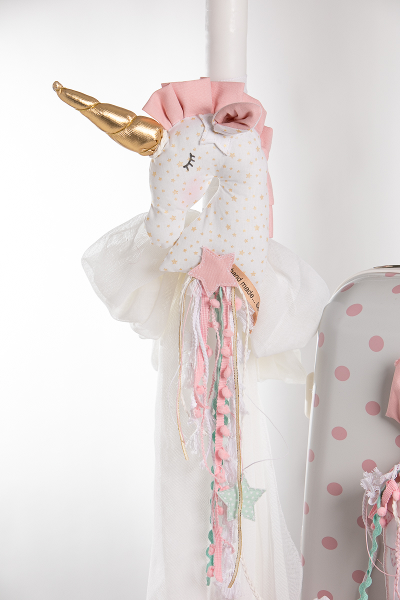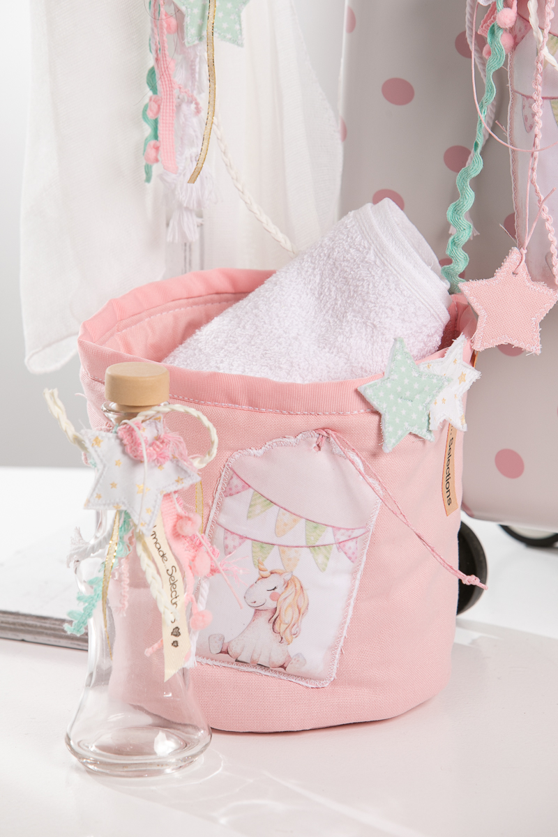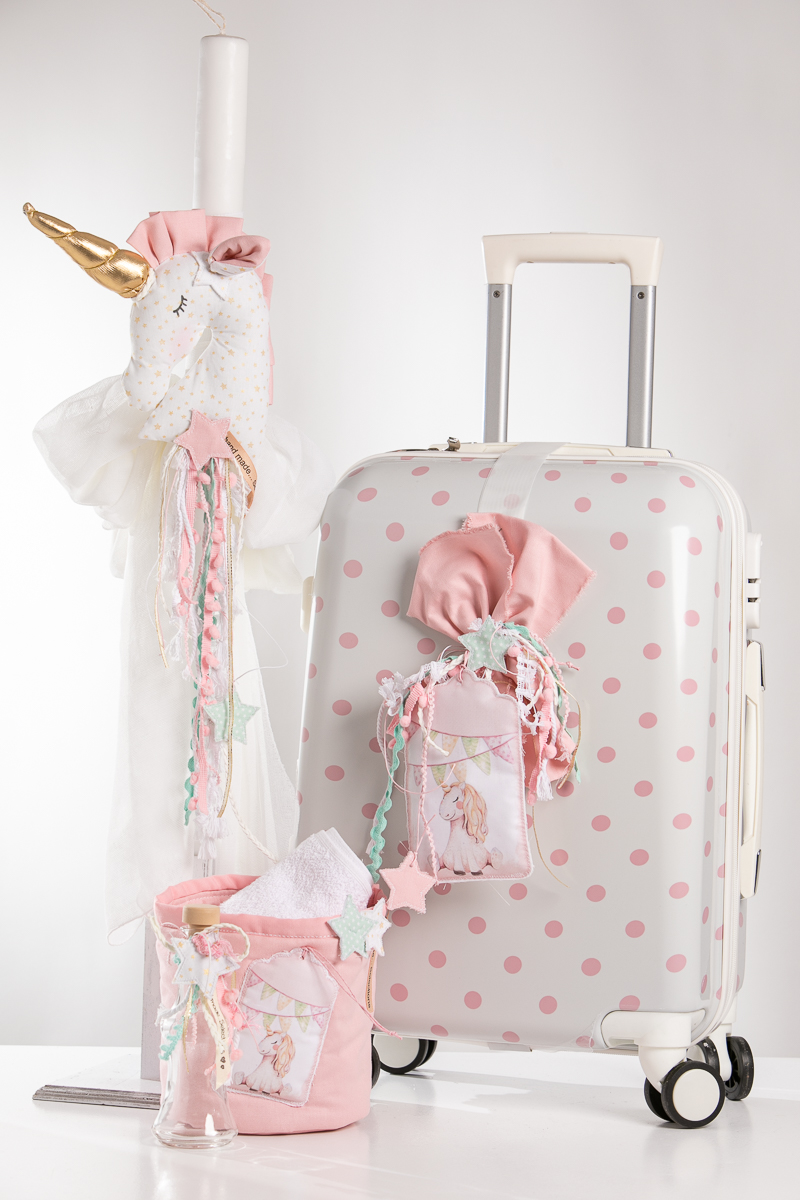 Ολοκληρωμένο πακέτο βάπτισης με θέμα μονόκερος. Το πακέτο περιλαμβάνει τροχήλατη βαλίτσα, λαδόπανα, 3 κεράκια κολυμπήθρας, σαπουνάκι, μπουκαλάκι λαδιού και 50 μαρτυρικά