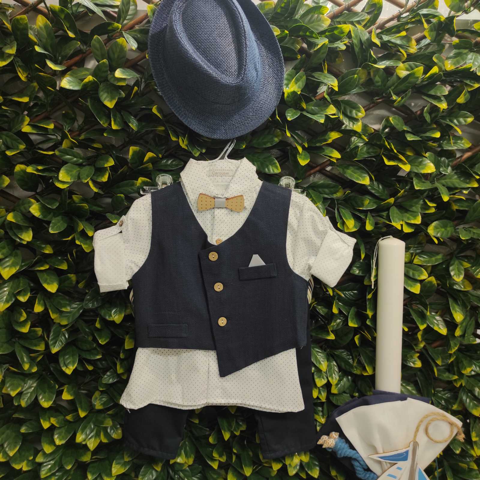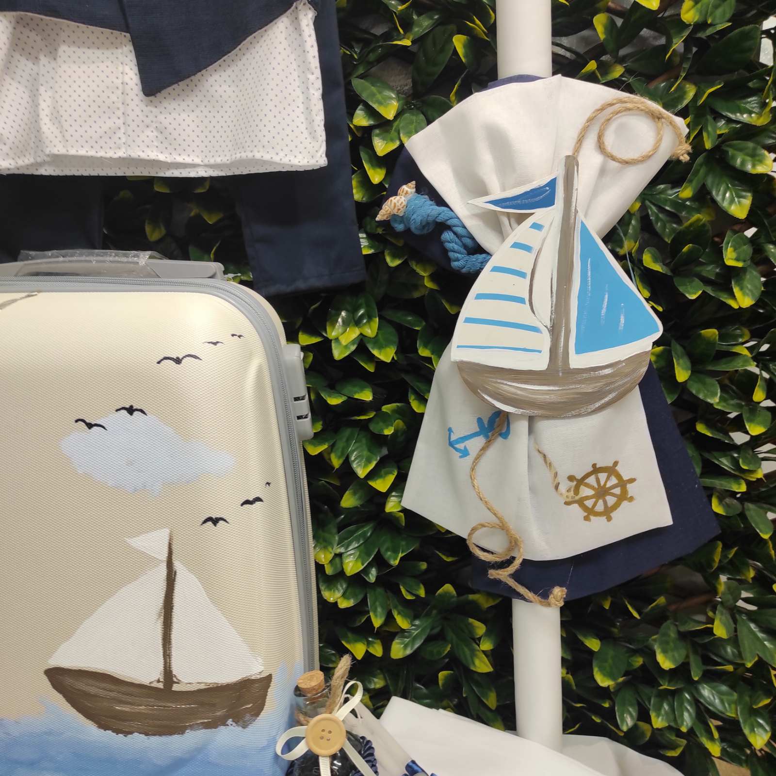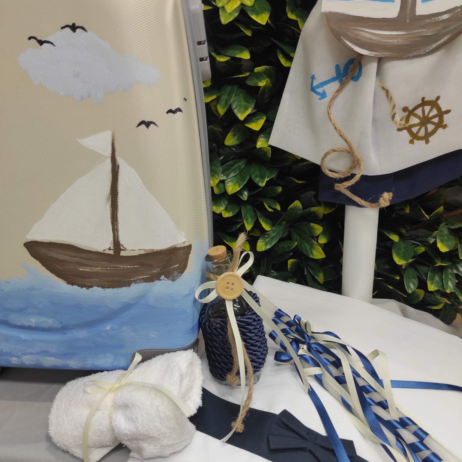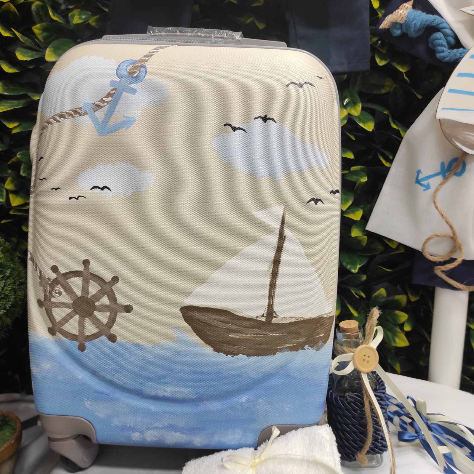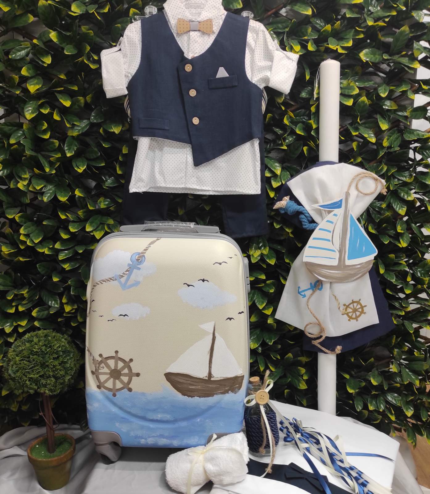 Ολοκληρωμένο πακέτο βάπτισης με ναυτικό, ζωγραφισμένο στο χέρι. Το πακέτο περιλαμβάνει τροχήλατη βαλίτσα, λαδόπανα, 3 κεράκια κολυμπήθρας, σαπουνάκι, μπουκαλάκι λαδιού και 50 μαρτυρικά.