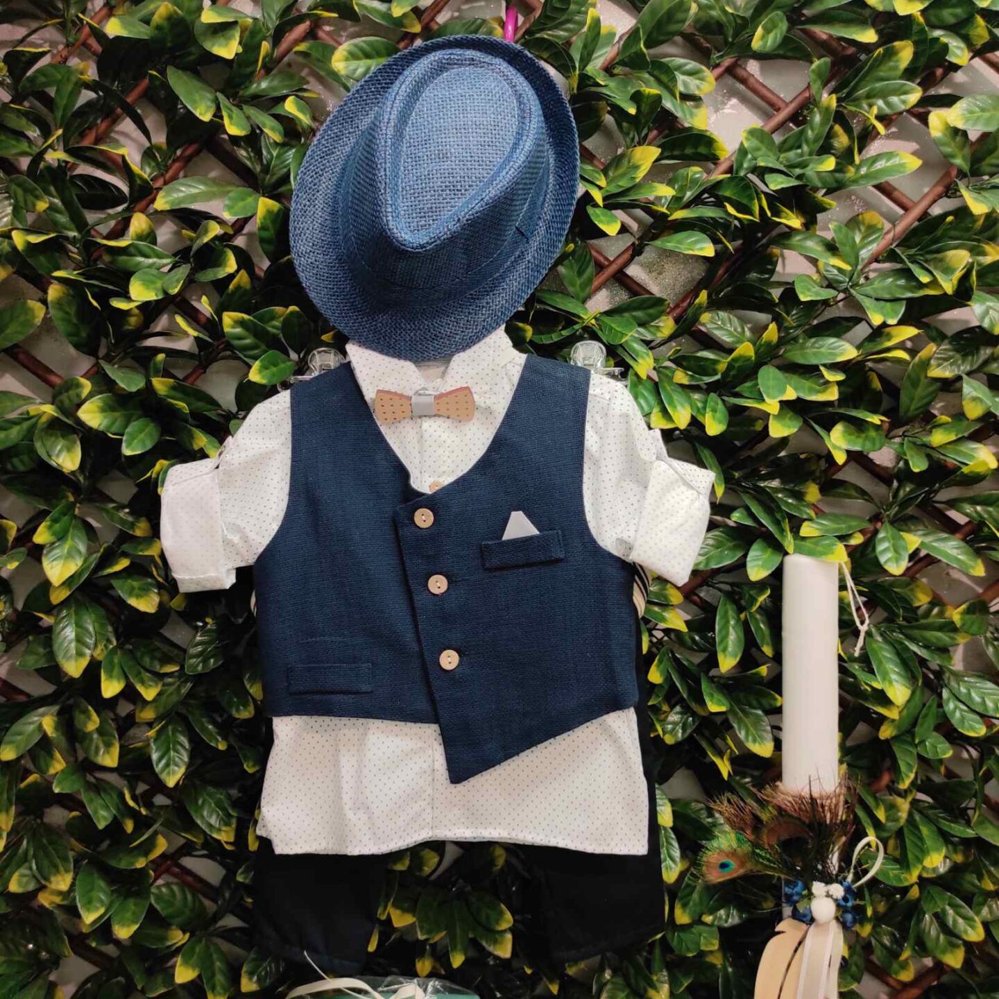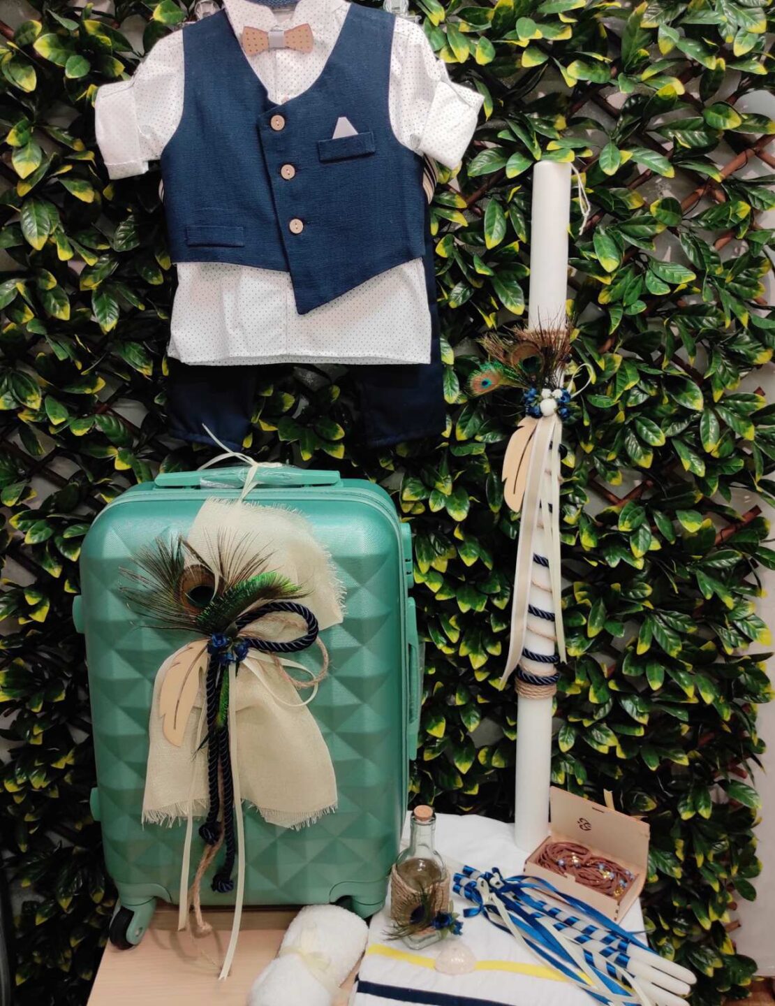 Ολοκληρωμένο πακέτο βάπτισης με θέμα παγόνι. Το πακέτο περιλαμβάνει τροχήλατη βαλίτσα, λαδόπανα, 3 κεράκια κολυμπήθρας, σαπουνάκι, μπουκαλάκι λαδιού, 50 μαρτυρικά και καλτσούλες.