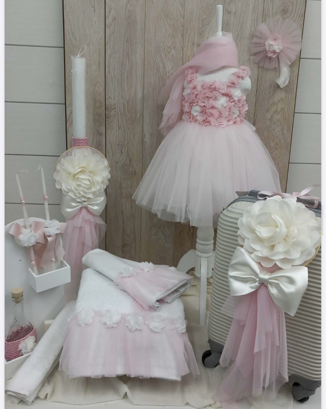 Ολοκληρωμένο πακέτο βάπτισης σε ροζ αποχρώσεις. Το πακέτο περιλαμβάνει τροχήλατη βαλίτσα, λαδόπανα, 3 κεράκια κολυμπήθρας, σαπουνάκι, μπουκαλάκι λαδιού, 50 μαρτυρικά και καλτσούλες.