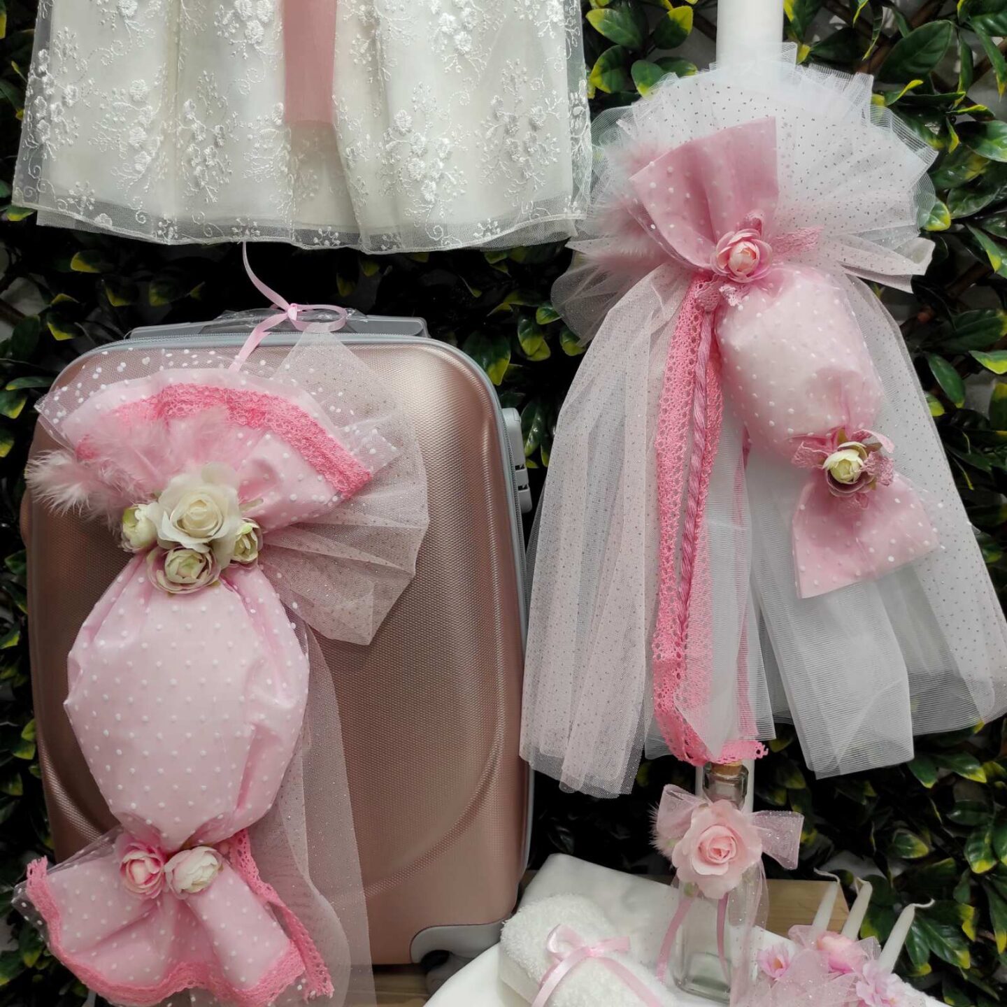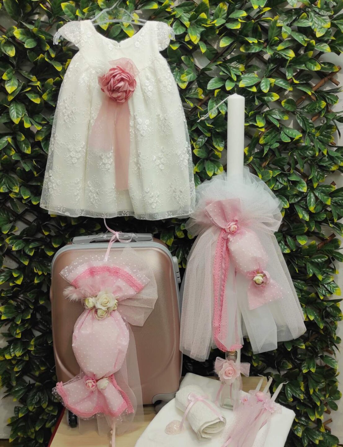 Ολοκληρωμένο πακέτο βάπτισης με θέμα τριαντάφυλλο. Το πακέτο περιλαμβάνει τροχήλατη βαλίτσα, λαδόπανα, 3 κεράκια κολυμπήθρας, σαπουνάκι, μπουκαλάκι λαδιού, 50 μαρτυρικά και καλτσούλες.
