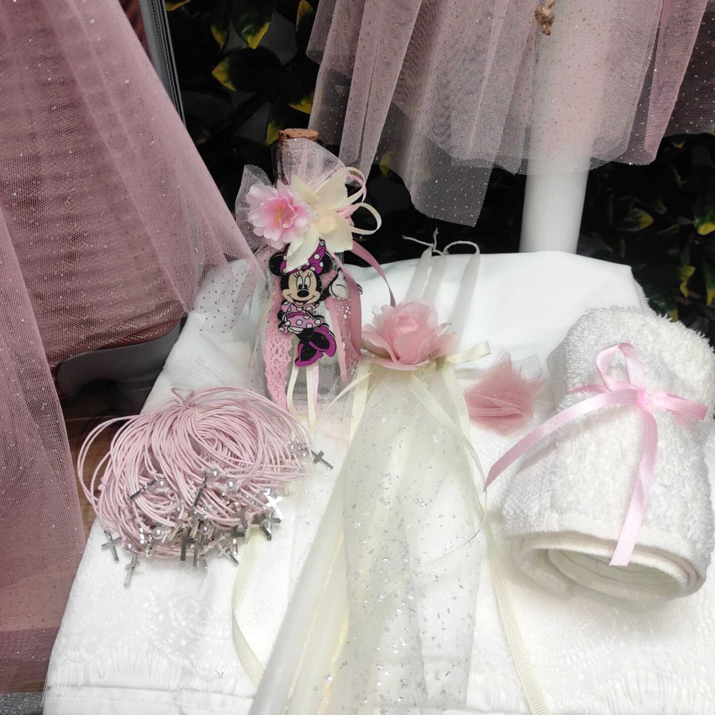 Ολοκληρωμένο πακέτο βάπτισης με θέμα mini mouse. Το πακέτο περιλαμβάνει τροχήλατη βαλίτσα, λαδόπανα, 3 κεράκια κολυμπήθρας, σαπουνάκι, μπουκαλάκι λαδιού, 50 μαρτυρικά και καλτσούλες.