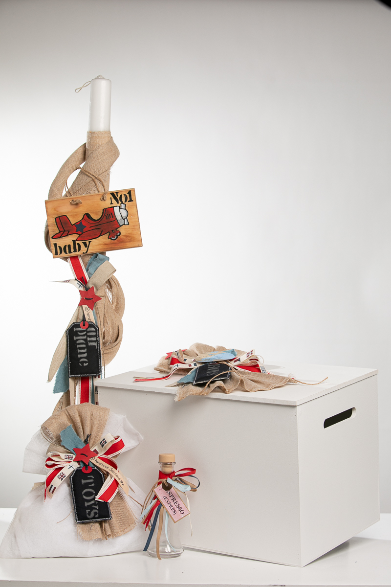 Ολοκληρωμένο πακέτο βάπτισης με θέμα travel boy. Το πακέτο περιλαμβάνει ξύλινο μπαούλο, λαδόπανα, 3 κεράκια κολυμπήθρας, σαπουνάκι, μπουκαλάκι λαδιού και 50 μαρτυρικά.