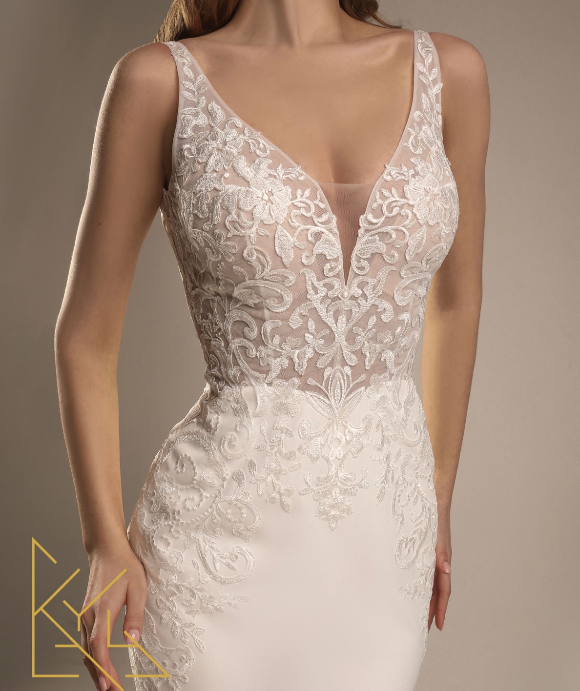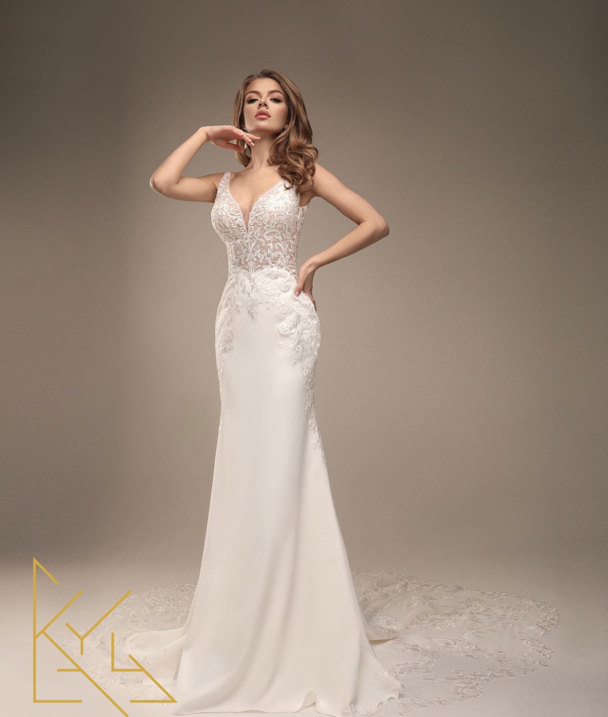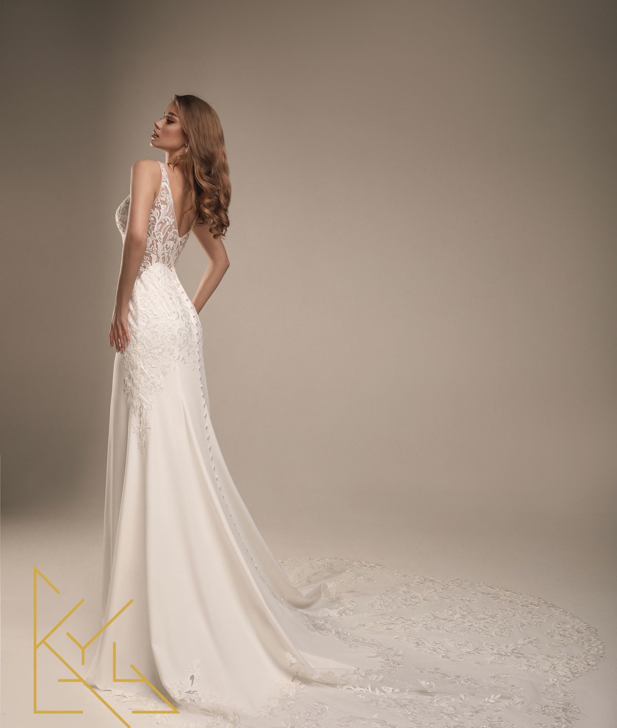 Πανέμορφο νυφικό με εντυπωσιακή ουρά. Το κρεπ σατέν νυφικό σε Α γραμμή συνδυάζει διαχρονική κομψότητα με ρομαντική πολυτέλεια. Η άνετη και θηλυκή Α γραμμή χαρίζει χάρη και αρμονία σε κάθε σιλουέτα, ενώ η δαντελένια ουρά προσθέτει επιβλητικότητα και αέρινη κίνηση. Το κεντημένο μπούστο με φίνα δαντέλα αναδεικνύει τη θηλυκότητα, ενώ η πλάτη σε βαθύ V χαρίζει αίσθηση σαγήνης και σύγχρονης κομψότητας. Ένα νυφικό που ισορροπεί ανάμεσα στη μίνιμαλ αισθητική και τη λαμπερή πολυτέλεια, ιδανικό για τη νύφη που ονειρεύεται μια εντυπωσιακή αλλά και ρομαντική εμφάνιση.Κρεπ σατέν νυφικό σε Α γραμμή με δαντελένια ουρά, κεντημένο μπούστο και πλάτη σε βαθύ V. Ένα κομψό και ρομαντικό νυφικό που συνδυάζει μίνιμαλ φινέτσα και πολυτέλεια για την ημέρα του γάμου σας.
