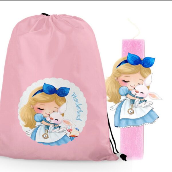 Πασχαλινή Λαμπάδα Αλίκη στη χώρα των θαυμάτων! Συνοδεύεται με δώρο τσάντα πλάτης για τις βόλτες του παιδιού. Ανάγλυφη αρωματική λαμπάδα διάστασης 24 x 4,4 x 2 εκ. με ξύλινη διακοσμητική φιγούρα διάστασης 10 x 15 εκ. με εκτύπωση και περιγραμματική κοπή. Η τσάντα backpack έχει διαστάσεις 26 x 36 εκ. με τυπωμένη στάμπα Φ12εκ. στο θέμα της λαμπάδας.