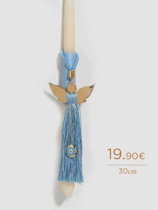 Πασχαλινή Λαμπάδα για αγόρι με επίχρυσο γούρι με αγγελάκι και ματάκι ως διακοσμητικό, γαλάζια μεταξωτή φούντα και σατέν κορδόνι. Το διακοσμητικό μπορεί να γίνει κρεμαστό γούρι για το παιδικό δωμάτιο! Χειροποίητη δημιουργία Tresento επιχρυσωμένο με 24 καράτια.