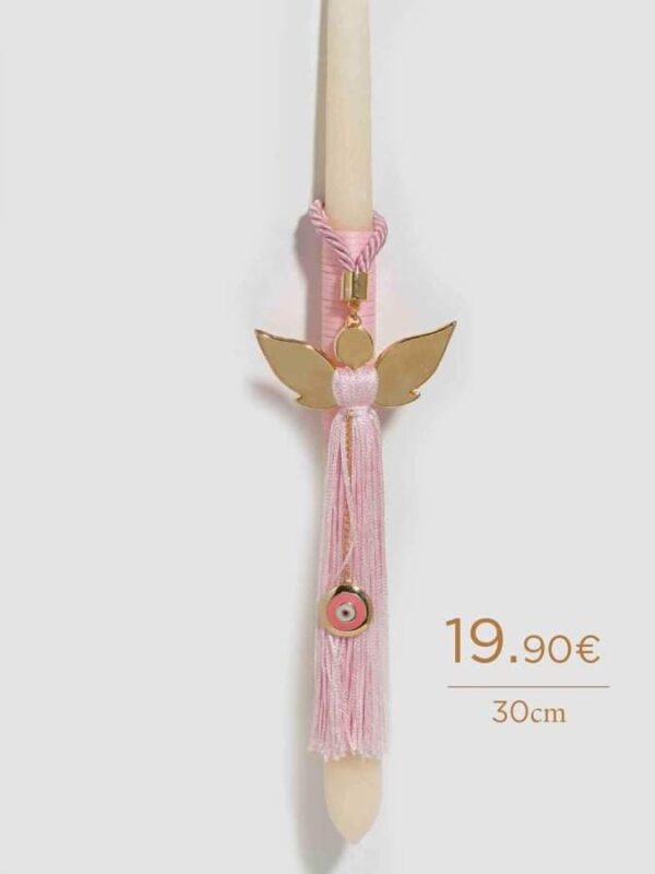Πασχαλινή Λαμπάδα για κορίτσι με επίχρυσο γούρι με αγγελάκι και ματάκι από ροζ σμάλτο ως διακοσμητικό, με ροζ μεταξωτή φούντα και σατέν κορδόνι. Το διακοσμητικό μπορεί να γίνει κρεμαστό γούρι για το παιδικό δωμάτιο ή μπρελόκ! Χειροποίητη δημιουργία Tresento επιχρυσωμένο με 24 καράτια.