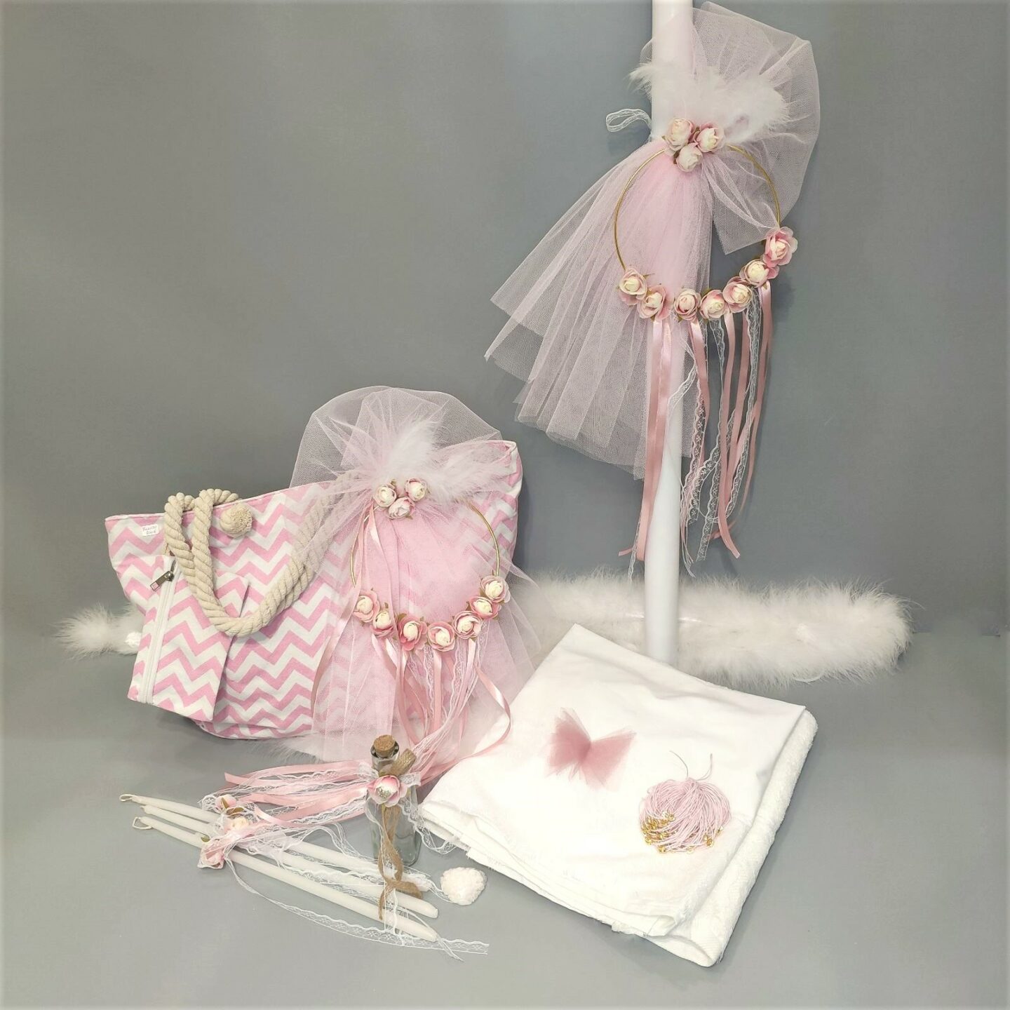 Πλήρες σετ βάπτισης για κορίτσι με vintage στεφανάκι με τριαντάφυλλα. Το σετ περιλαμβάνει στολισμένη υφασμάτινη τσάντα, στολισμός λαμπάδας (δεν συμπεριλαμβάνεται το κερί), εσώρουχα, λαδόπανα, πετσέτες, σαπουνάκια, στολισμένο μπουκαλάκι λαδιού, 3 κεράκια στολισμένα, 50 μαρτυρικά