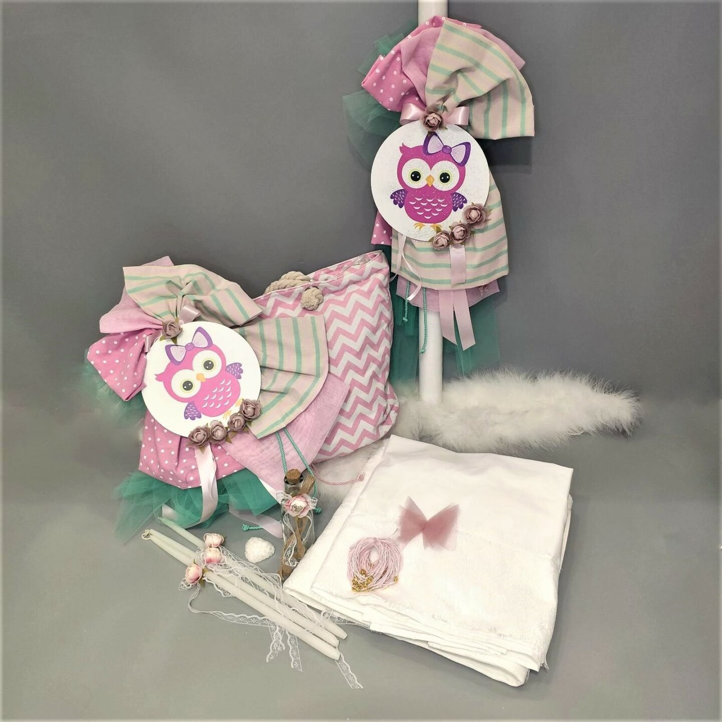 Πλήρες σετ βάπτισης για κορίτσι με Κουκουβάγια. Το σετ περιλαμβάνει στολισμένη υφασμάτινη τσάντα, στολισμός λαμπάδας (δεν συμπεριλαμβάνεται το κερί), εσώρουχα, λαδόπανα, πετσέτες, σαπουνάκια, στολισμένο μπουκαλάκι λαδιού, 3 κεράκια στολισμένα, 50 μαρτυρικά