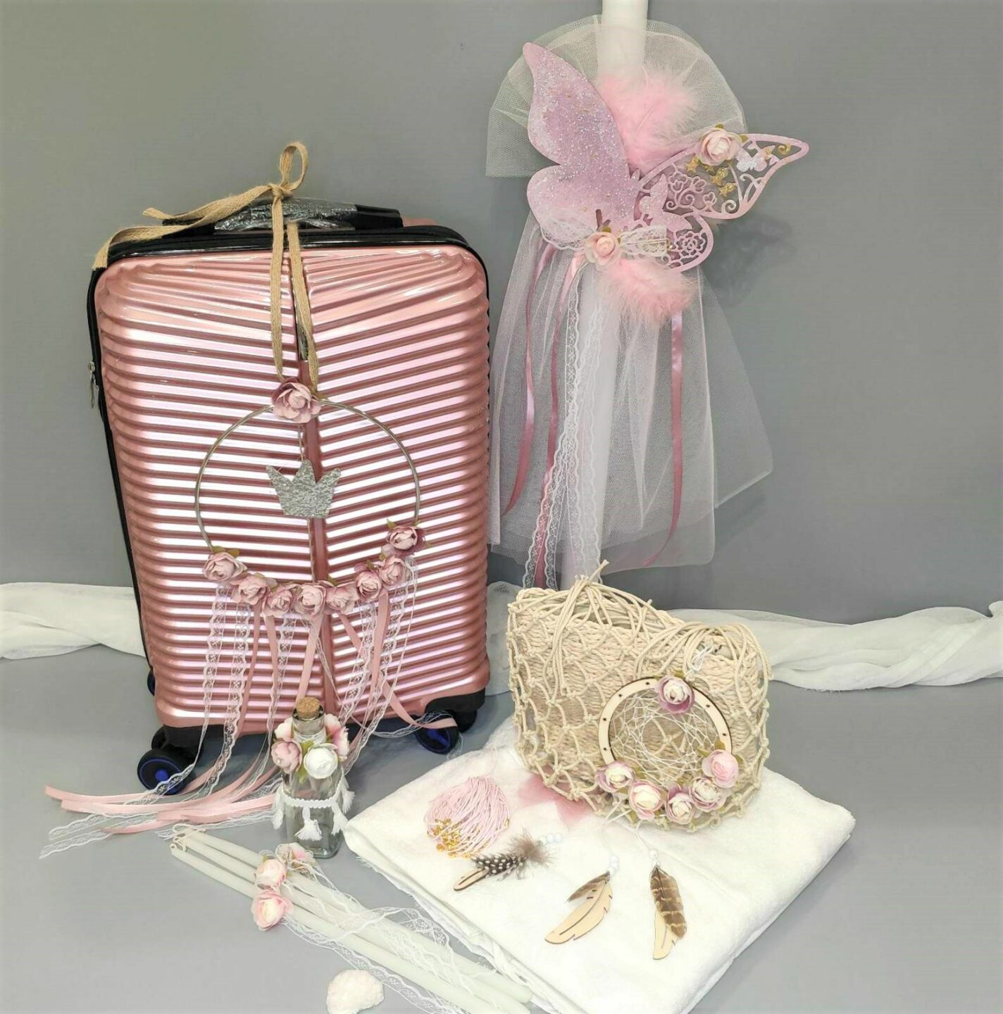 Πλήρες σετ βάπτισης για κορίτσι με πεταλούδες. Το σετ περιλαμβάνει στολισμένη τροχήλατη βαλίτσα ταξιδίου, επιπλέον ψάθινη τσάντα στολισμένη, στολισμός λαμπάδας (δεν συμπεριλαμβάνεται το κερί), εσώρουχα, λαδόπανα, πετσέτες, σαπουνάκια, στολισμένο μπουκαλάκι λαδιού, 3 κεράκια στολισμένα, 50 μαρτυρικά