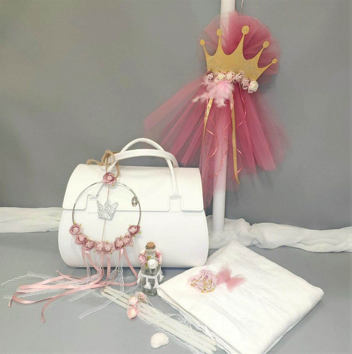 Πλήρες σετ βάπτισης για κορίτσι με πριγκιπική κορώνα. Το σετ περιλαμβάνει στολισμένη δερμάτινη τσάντα, στολισμός λαμπάδας (δεν συμπεριλαμβάνεται το κερί), εσώρουχα, λαδόπανα, πετσέτες, σαπουνάκια, στολισμένο μπουκαλάκι λαδιού, 3 κεράκια στολισμένα, 50 μαρτυρικά