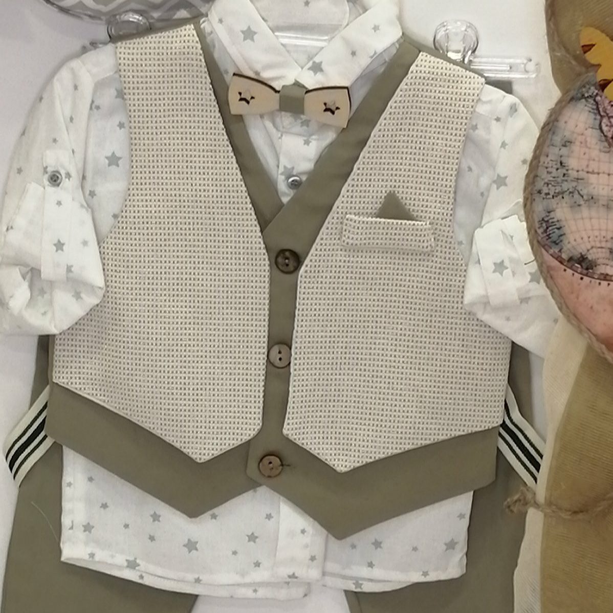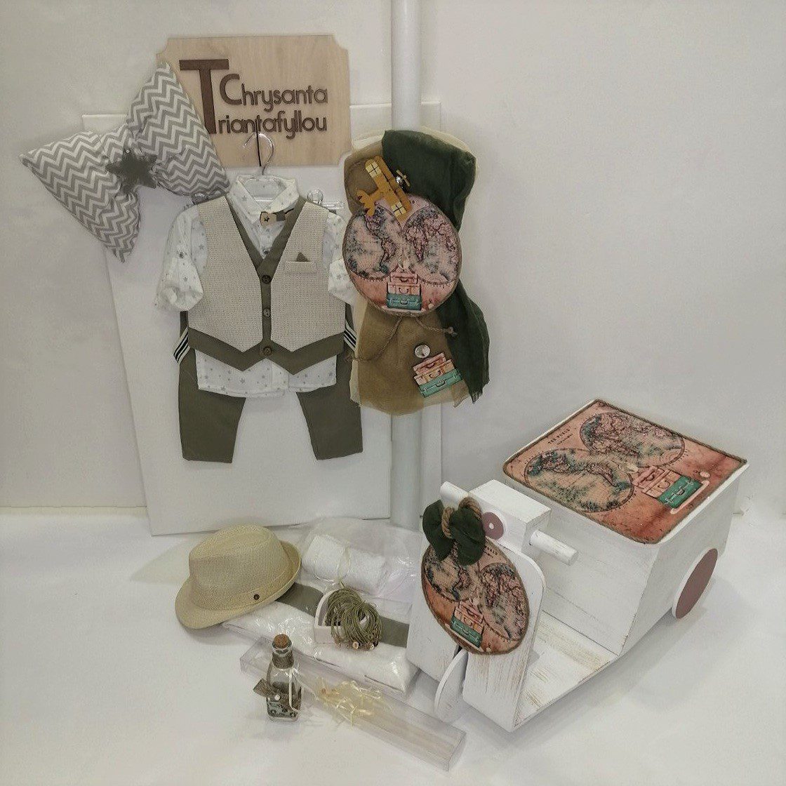 Σετ βάπτισης με βέσπα και θέμα ταξίδια, ο γύρος του κόσμου με ένα αεροπλάνο. Το σετ περιλαμβάνει το βαπτιστικό ρούχο σε γήινες αποχρώσεις του χακί, ξύλινη βέσπα με αποθηκευτικό χώρο, ζωγραφισμένη με τον παγκόσμιο χάρτη σε αποχρώσεις του καφέ, με τεχνική decoupage, στολισμός λαμπάδας με το ίδιο θέμα σε ξύλινο στρογγυλό διακοσμητικό (δεν συμπεριλαμβάνεται το κερί), 50 μαρτυρικά, 3 κεράκια, μπουκαλάκι λαδιού, σαπουνάκια, πετσέτες, σετ λαδόπανα και εσώρουχα.