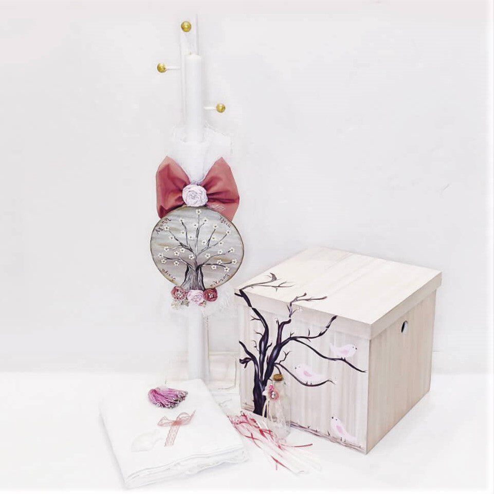 Πλήρες σετ βάπτισης με θέμα ανθισμένη αμυγδαλιά και πουλάκια, με ξύλινο αποθηκευτικό κύβο. Το σετ περιλαμβάνει ξύλινο αποθηκευτικό κύβο ζωγραφισμένο στο χέρι, στολισμό λαμπάδας (δεν συμπεριλαμβάνεται το κερί), 50 μαρτυρικά, 3 κεράκια στολισμένα, μπουκαλάκι λαδιού, σαπουνάκια, πετσέτες, σετ λαδόπανα και εσώρουχα. Τα ξύλινα διακοσμητικά στοιχεία είναι με ψηφιακή έγχρωμη εκτύπωση στο ίδιο θέμα. Το σετ κουτί βάφτισης είναι χειροποίητο και χρειάζεται 10-12 μέρες παράδοσης.