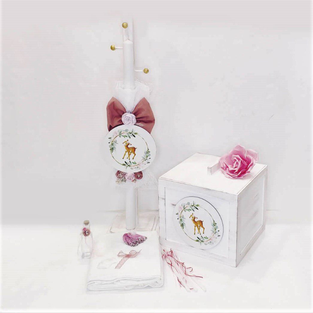 Πλήρες σετ βάπτισης με θέμα το ελαφάκι με αποθηκευτικό κύβο. Το σετ περιλαμβάνει στολισμένο ξύλινο κύβο με αποθηκευτικό χώρο, στολισμό λαμπάδας (δεν συμπεριλαμβάνεται το κερί), 50 μαρτυρικά, 3 κεράκια στολισμένα, μπουκαλάκι λαδιού, σαπουνάκια, πετσέτες, σετ λαδόπανα και εσώρουχα. Τα ξύλινα διακοσμητικά στοιχεία είναι με ψηφιακή έγχρωμη εκτύπωση στο ίδιο θέμα. Το σετ κουτί βάφτισης είναι χειροποίητο και χρειάζεται 10-12 μέρες παράδοσης.