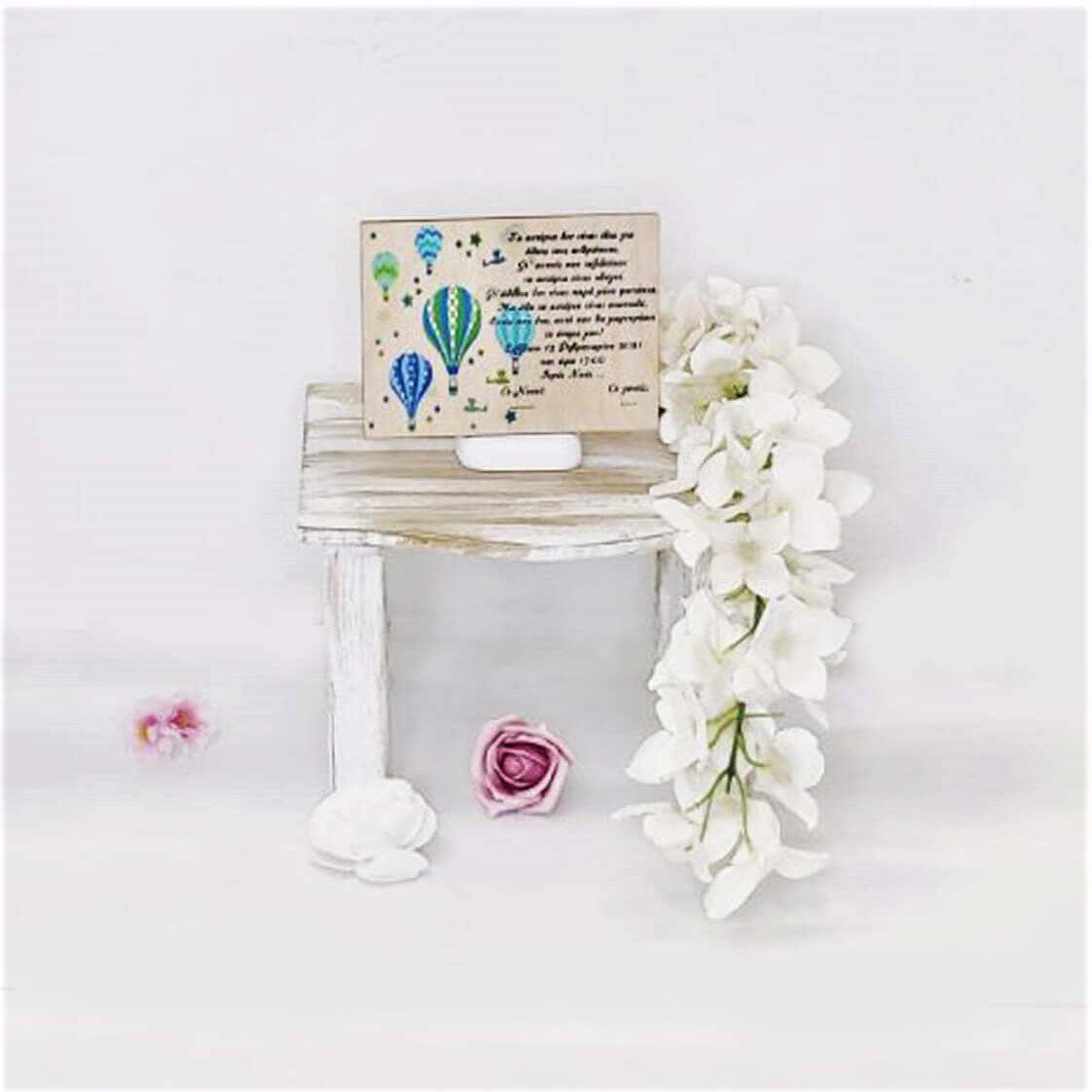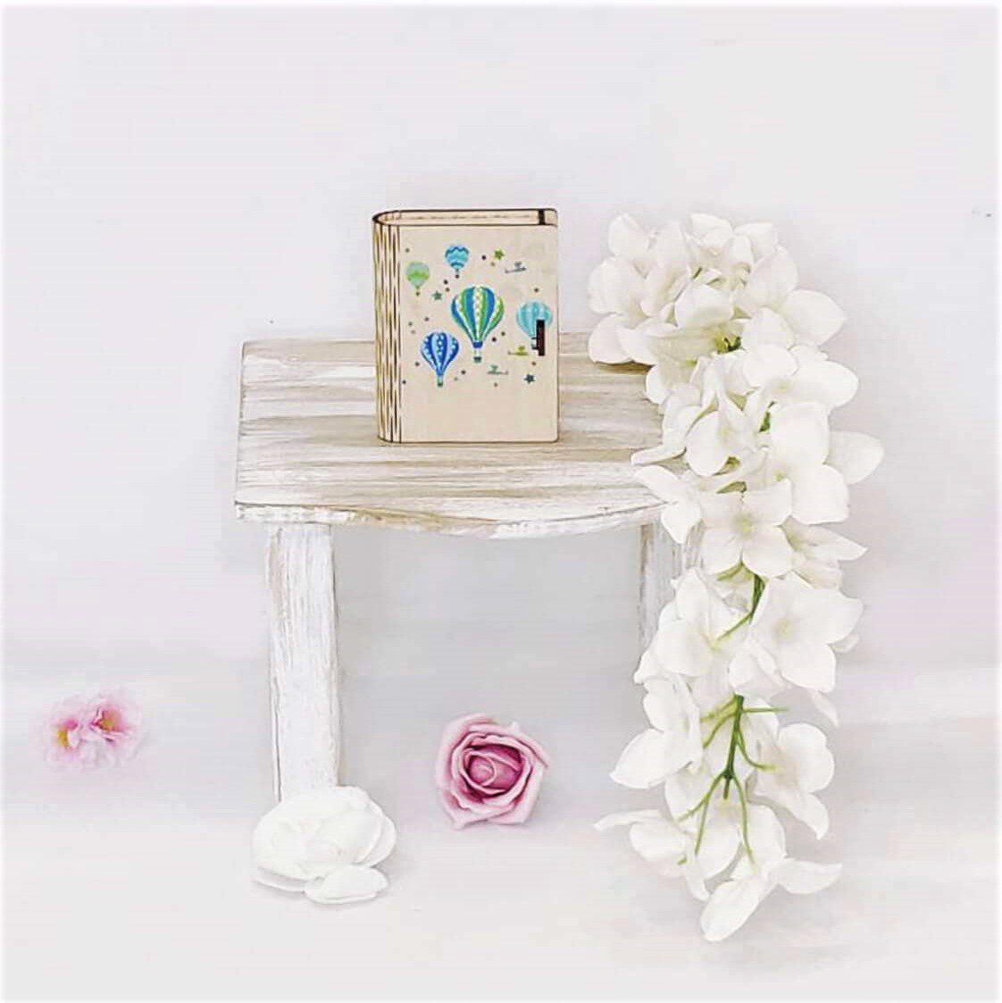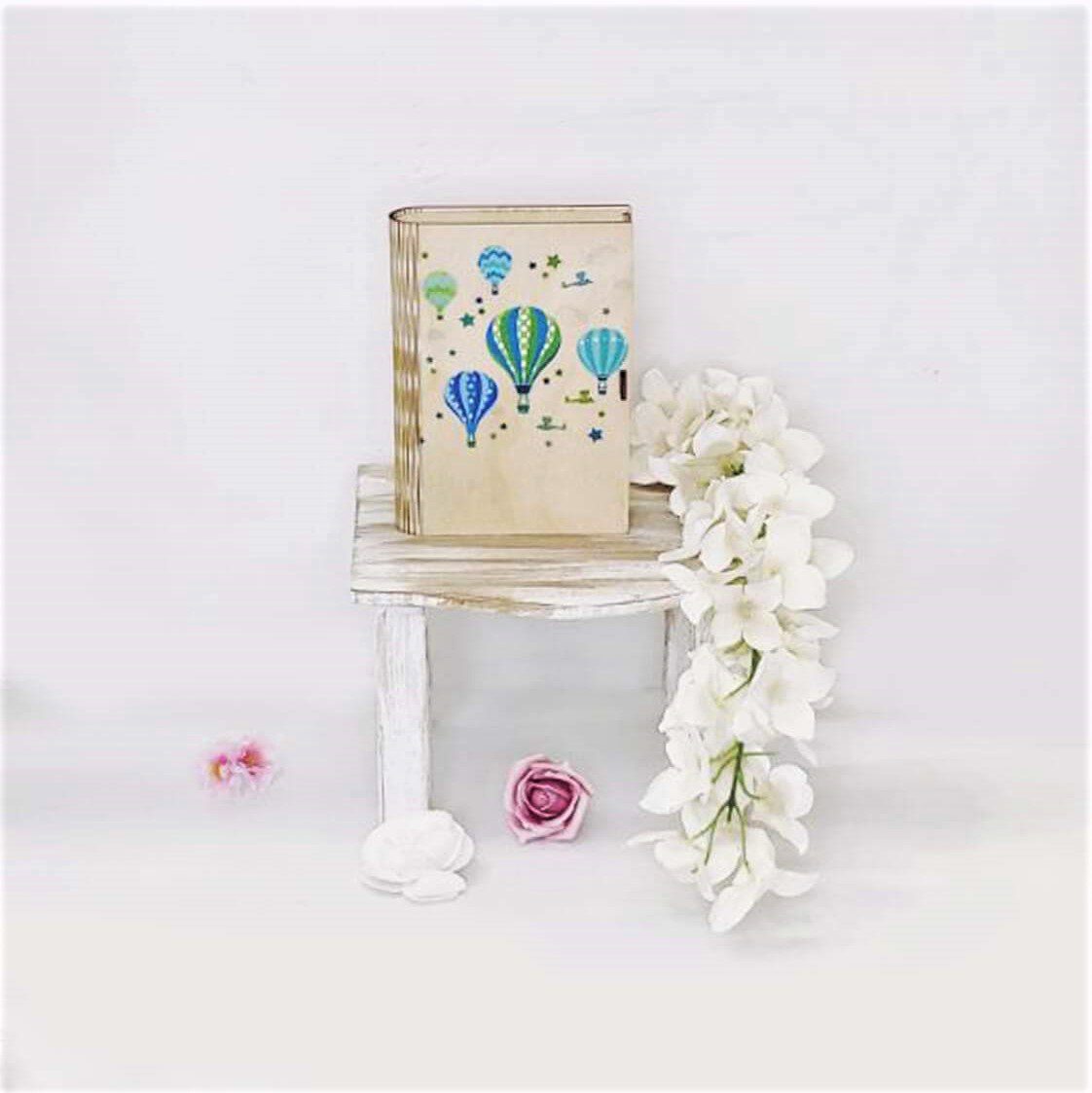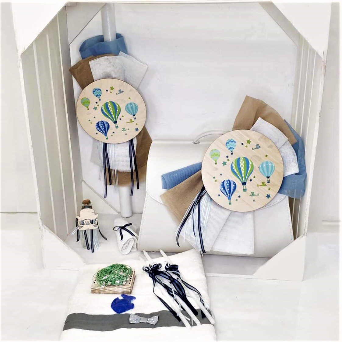 Πλήρες σετ βάπτισης με θέμα το Αερόστατο, με λευκή δερμάτινη βαλίτσα. Το σετ περιλαμβάνει τη δερμάτινη βαλίτσα στολισμένη, στολισμό λαμπάδας (δεν συμπεριλαμβάνεται το κερί), 50 μαρτυρικά με ξύλινο κουτί στο θέμα σας (ύψος 20εκ. πλάτος 15εκ), 3 κεράκια στολισμένα, μπουκαλάκι λαδιού, σαπουνάκια, πετσέτες, σετ λαδόπανα και εσώρουχα. Τα ξύλινα διακοσμητικά στοιχεία και το κουτί μαρτυρικών είναι με ψηφιακή έγχρωμη εκτύπωση στο ίδιο θέμα. Το σετ κουτί βάφτισης είναι χειροποίητο και χρειάζεται 10-12 μέρες παράδοσης.