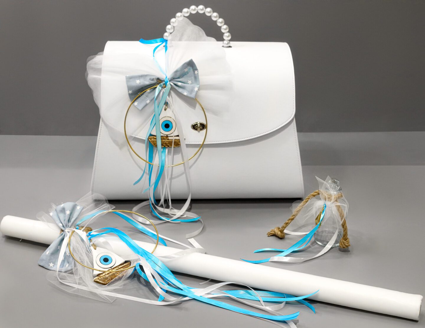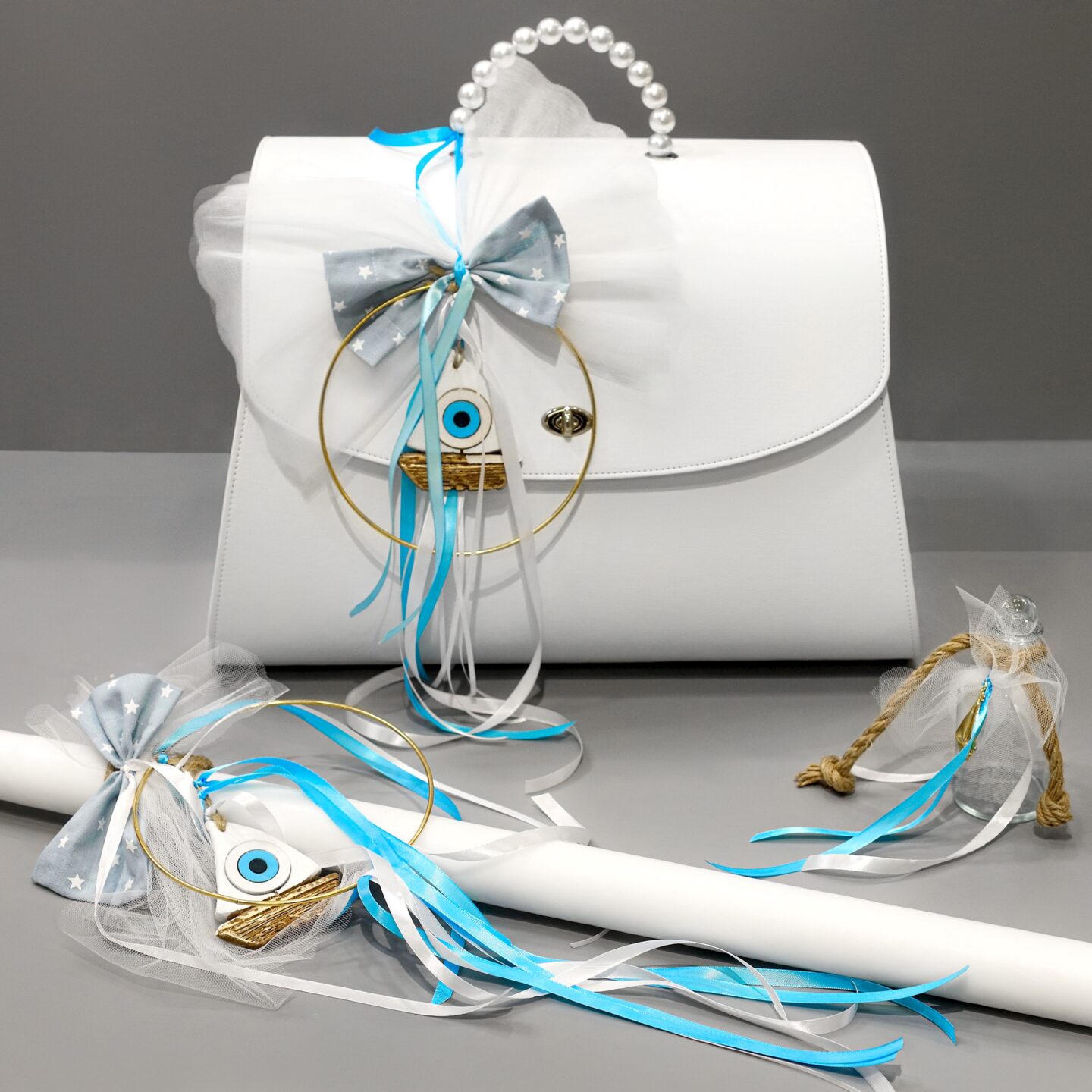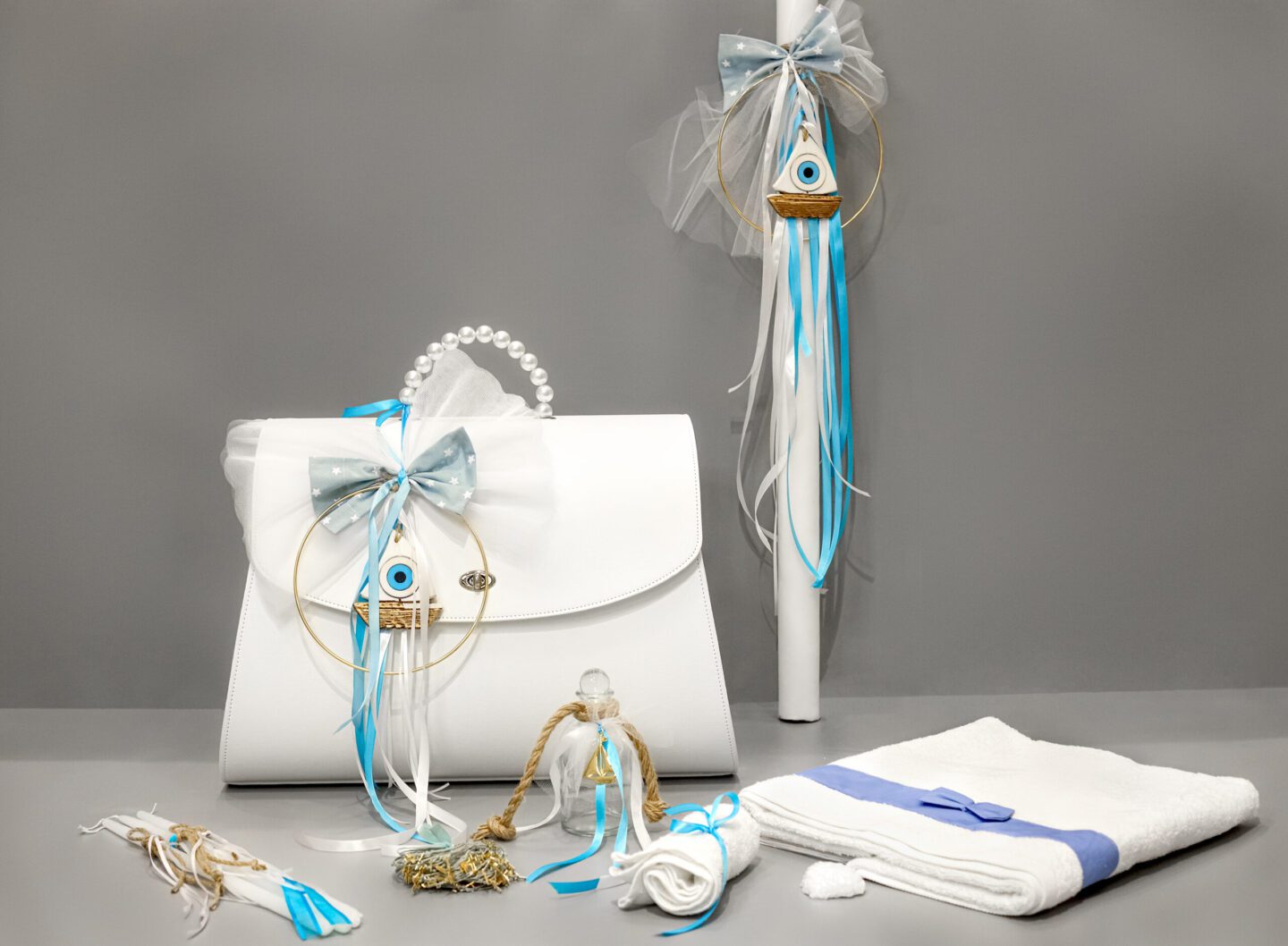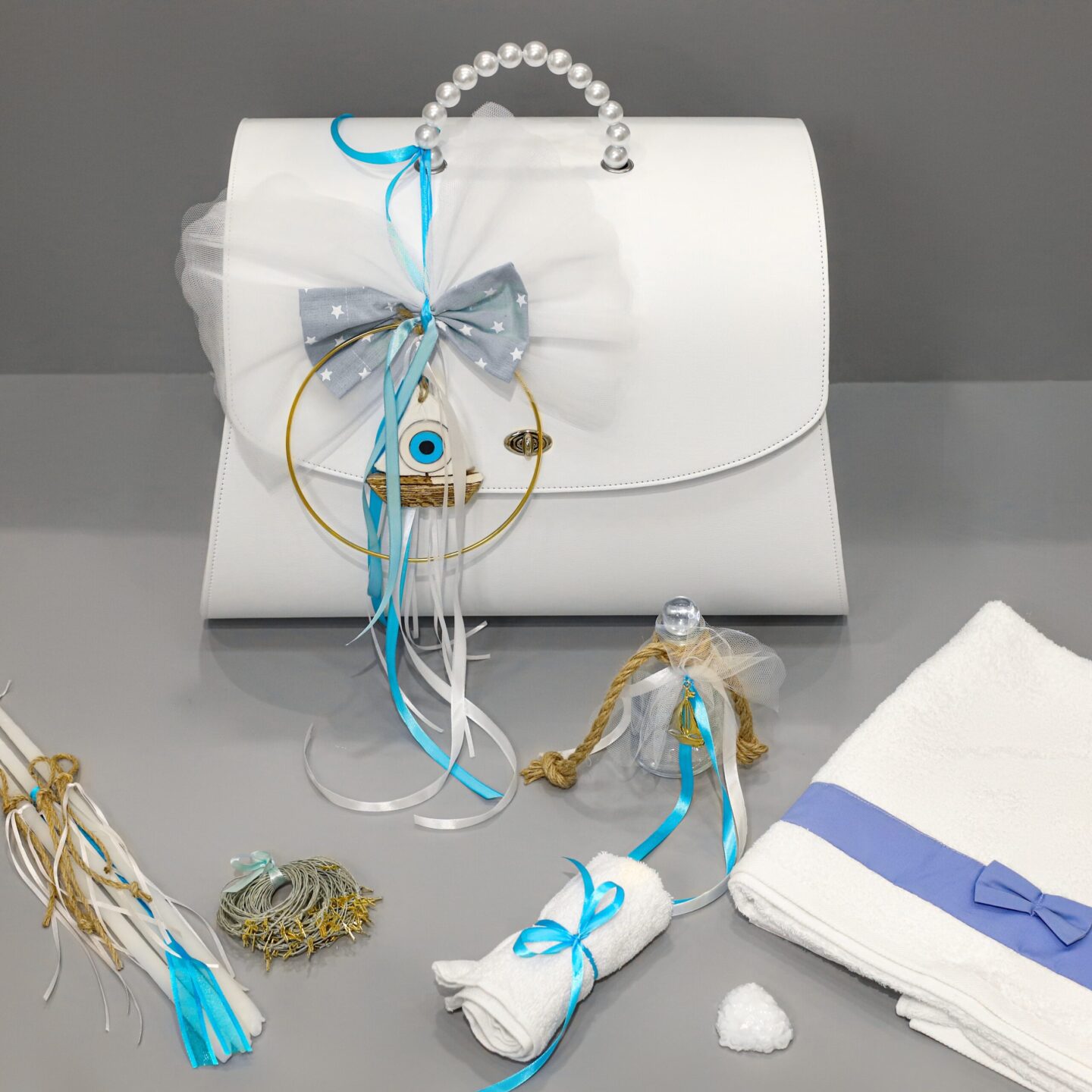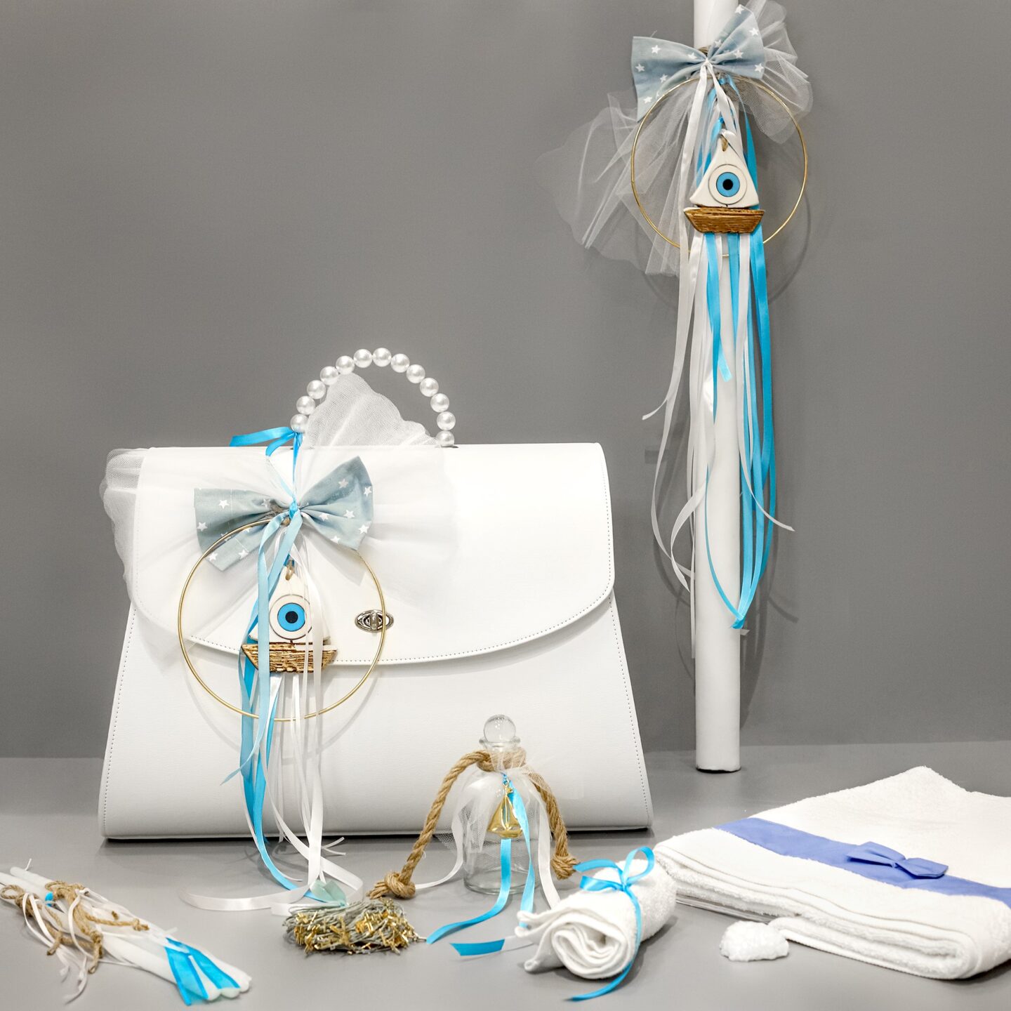 Πλήρες σετ βάπτισης με καράβι και ματάκι, γαλάζιο και λευκό. Συνοδεύεται από δερμάτινη βαλίτσα με πέρλες στο χερούλι. Το σετ περιλαμβάνει στολισμένη βαλίτσα, στολισμό λαμπάδας (δεν συμπεριλαμβάνεται το κερί), 50 μαρτυρικά, 3 κεράκια στολισμένα, μπουκαλάκι λαδιού, σαπουνάκια, πετσέτες, σετ λαδόπανα και εσώρουχα. Το σετ κουτί βάφτισης είναι χειροποίητο και χρειάζεται 10-12 μέρες παράδοσης.