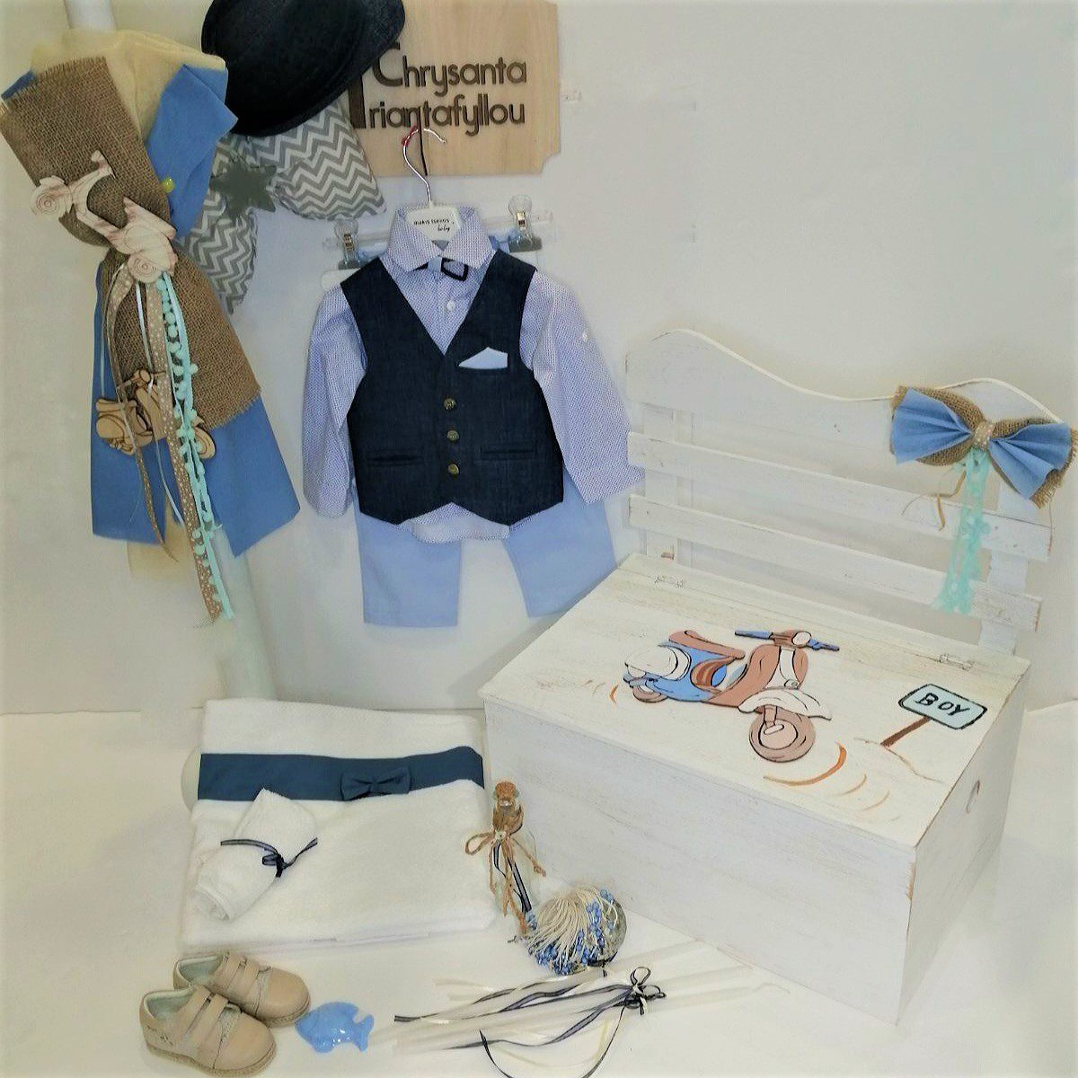 Πλήρες σετ βάπτισης με παγκάκι και θέμα βέσπα, συνδυασμένο με ρούχο και παπούτσι. Το σετ περιλαμβάνει ρούχο σε μπλε αποχρώσεις (μέγεθος 18-24 μηνών), ανατομικό δερμάτινο παπούτσι σε μπεζ (νούμερο 21), παγκάκι με αποθηκευτικό χώρο, με ζωγραφισμένη Βέσπα, στολισμός λαμπάδας διακοσμημένος με ξύλινη βέσπα (δεν συμπεριλαμβάνεται το κερί), 50 μαρτυρικά, 3 κεράκια, μπουκαλάκι λαδιού, σαπουνάκια, πετσέτες, σετ λαδόπανα και εσώρουχα. Στο συγκεκριμένο δεν γίνονται παραλλαγές σε ρούχα, παπούτσια ή μεγέθη. Το σετ κουτί βάφτισης είναι χειροποίητο και ζωγραφισμένο στο χέρι και χρειάζεται 10-12 μέρες παράδοσης.