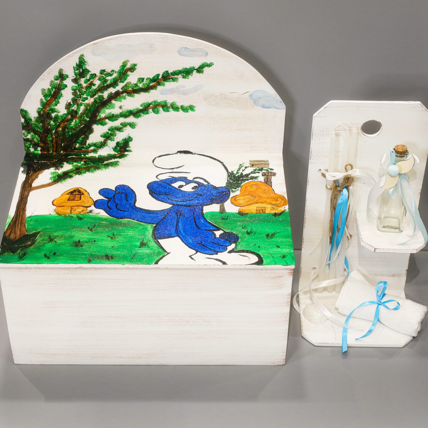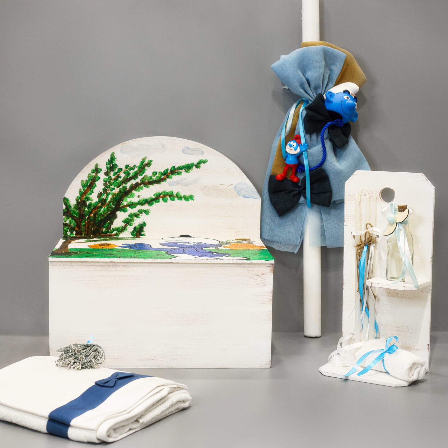 Πλήρες σετ βάπτισης ξύλινο παγκάκι με Στρουμφάκια. Το σετ περιλαμβάνει στολισμένο ξύλινο παγκάκι, στολισμό λαμπάδας (δεν συμπεριλαμβάνεται το κερί), 50 μαρτυρικά, 3 κεράκια στολισμένα, μπουκαλάκι λαδιού, σαπουνάκια, πετσέτες, σετ λαδόπανα και εσώρουχα. Το σετ κουτί βάφτισης είναι χειροποίητο και χρειάζεται 10-15 εργάσιμες μέρες παράδοσης.