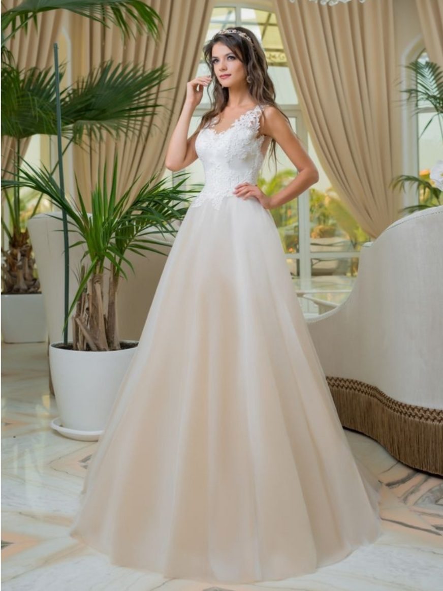 Πριγκηπικό Nυφικό με ιβουάρ φούστα, μπούστο κεντημένο με γαλλική δαντέλα και ανοιχτή πλάτη με διαφάνεια soleil κεντημένη με δαντέλα. Κανονική εφαρμογή