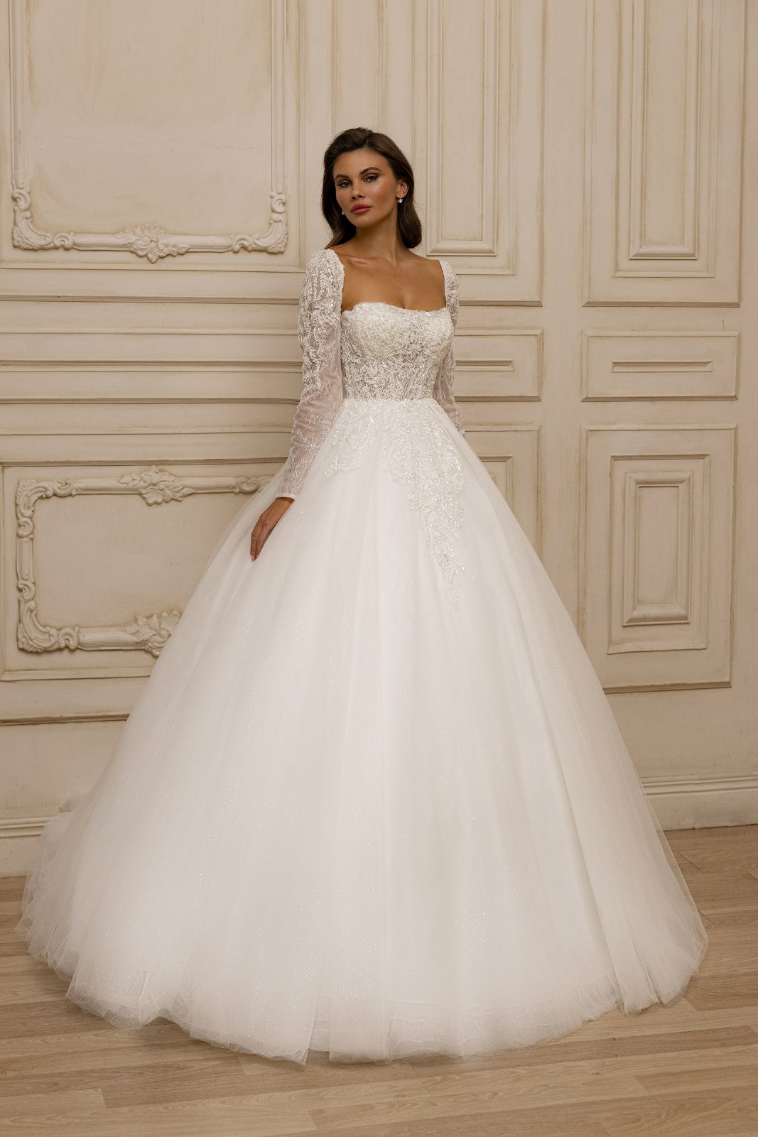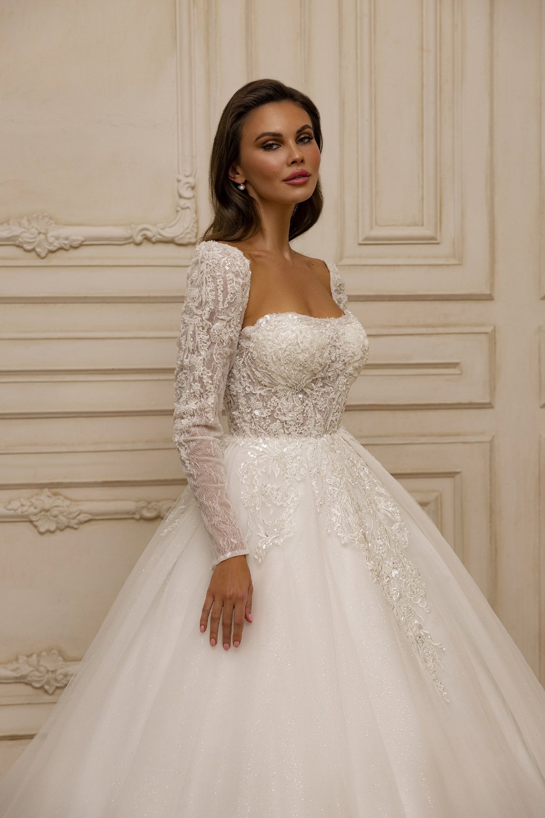 Πριγκιπικό νυφικό με μανίκια και ουρά. Στο πάνω μέρος διαθέτει κορσέ με κεντητά σχέδια και γκλίτερ.Διαθέτει πολύ μακριά ουρά