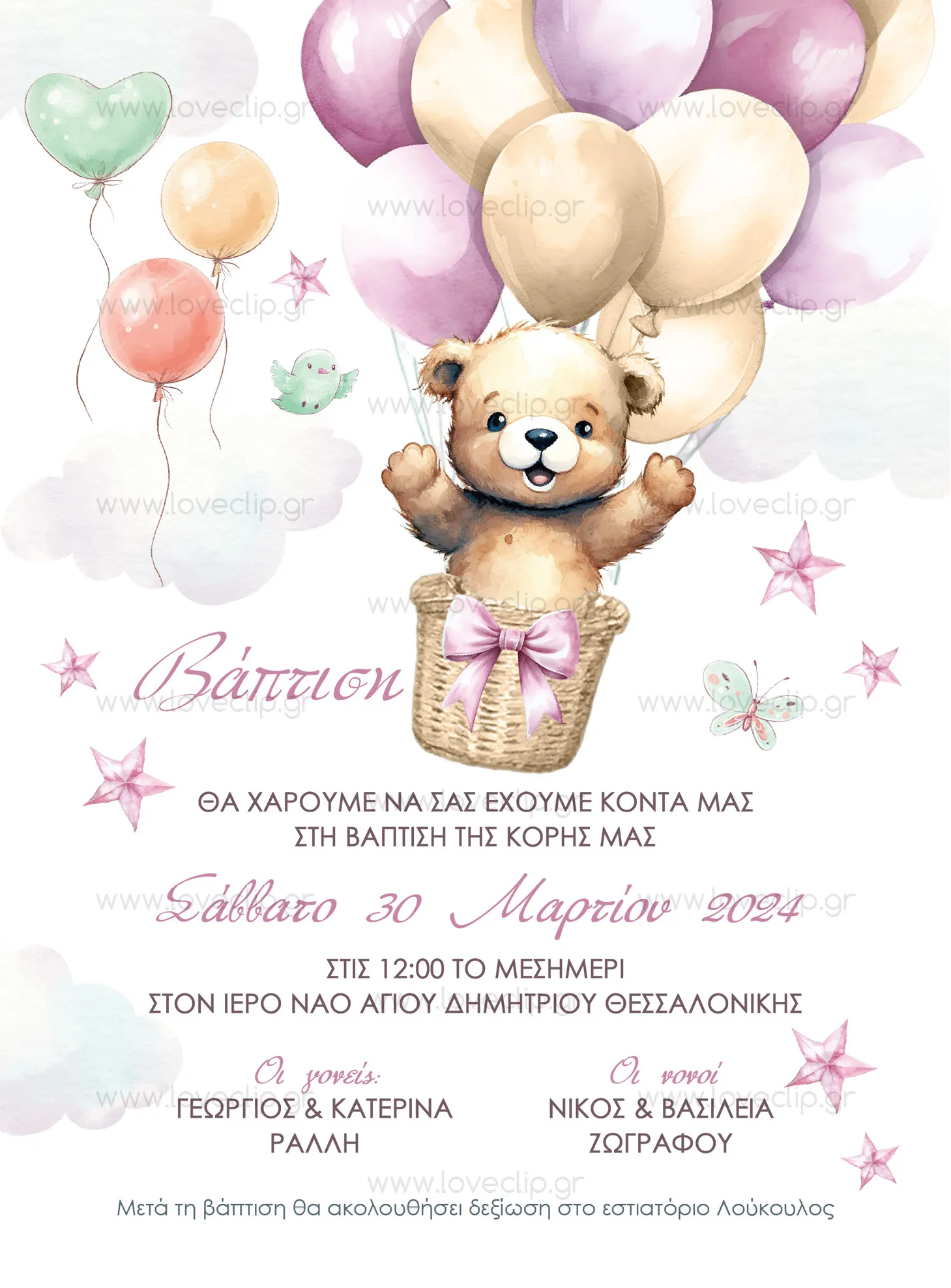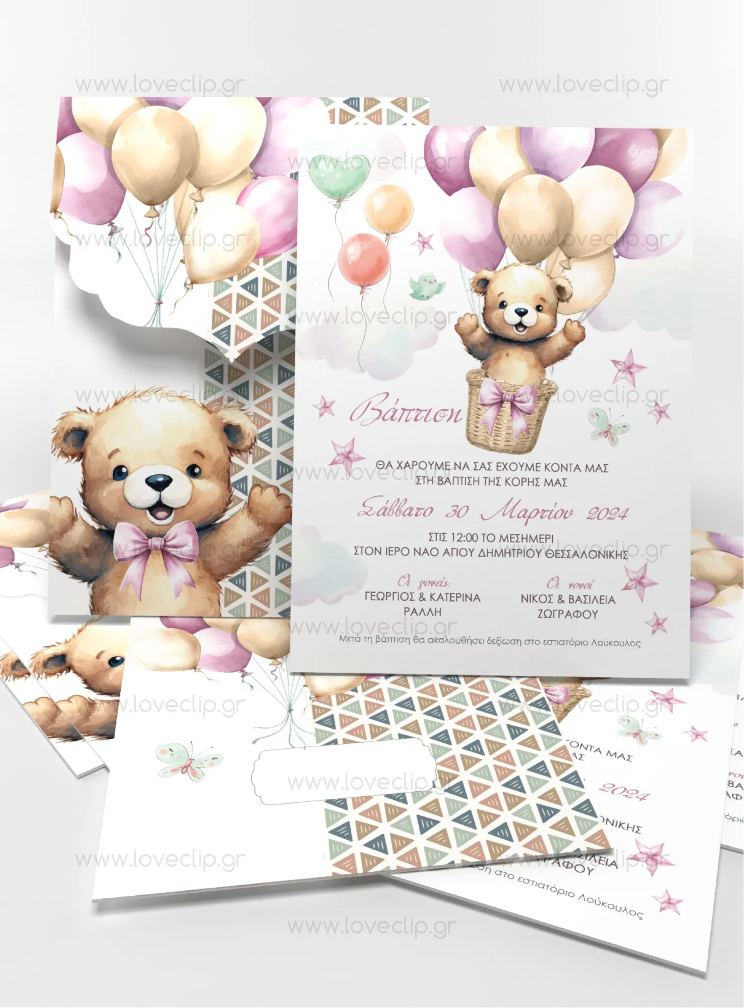 Προσκλητήριο Αρκουδάκι με μπαλόνια. Σας παρουσιάζουμε το προσκλητήριο βάπτισης για κορίτσι αρκουδάκι με μπαλόνια! Ετοιμαστείτε να ανεβάσετε επίπεδο στην ξεχωριστή μέρα του μικρού σας με αυτή την εκπληκτική πρόσκληση εμπνευσμένη από το κλασσικό λούτρινο αρκουδάκι. Με ζωηρά χρώματα boho και υπέροχα μπαλόνια που ταξιδεύουν το αρκουδάκι μας στον ουρανό, αυτή η πρόσκληση σίγουρα θα εντυπωσιάσει!