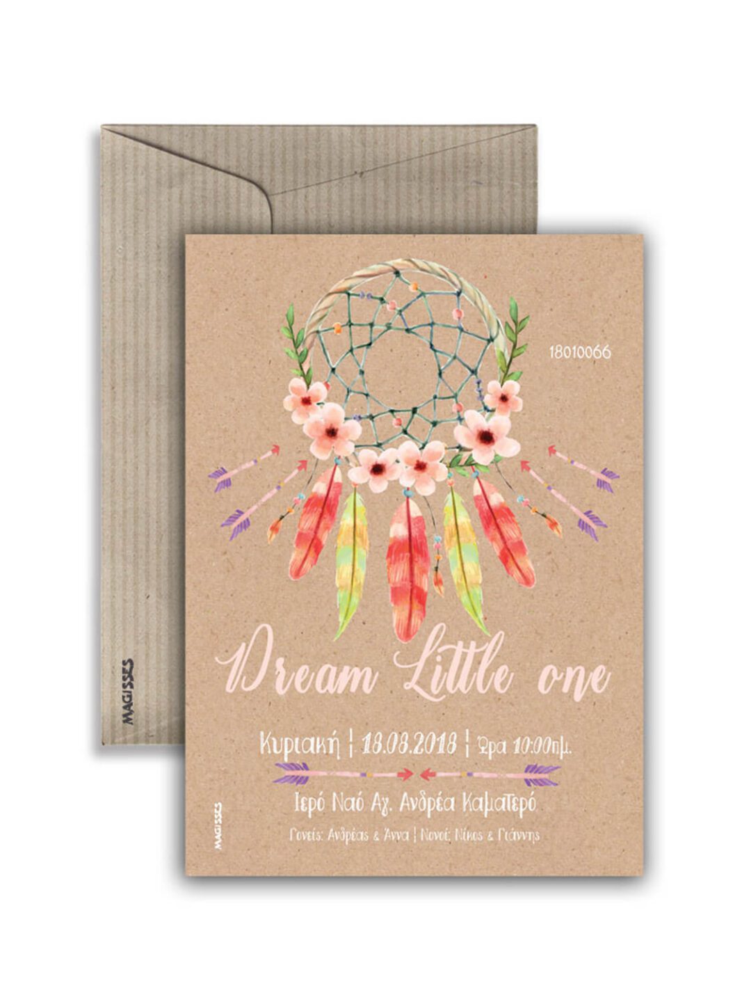 Προσκλητήριο Βάπτισης κατακόρυφο, από χαρτόνι στο χρώμα της άμμου, με θέμα την ονειροπαγίδα. Αποτελείται από τετράγωνο οριζόντιο σαγρέ φάκελο στο χρώμα της άμμου, με διαστάσεις 12,5×19 cm. Τα χρώματα εκτύπωσης και τα γραφικά, μπορούν να τροποποιηθούν κατ επιλογή του πελάτη.