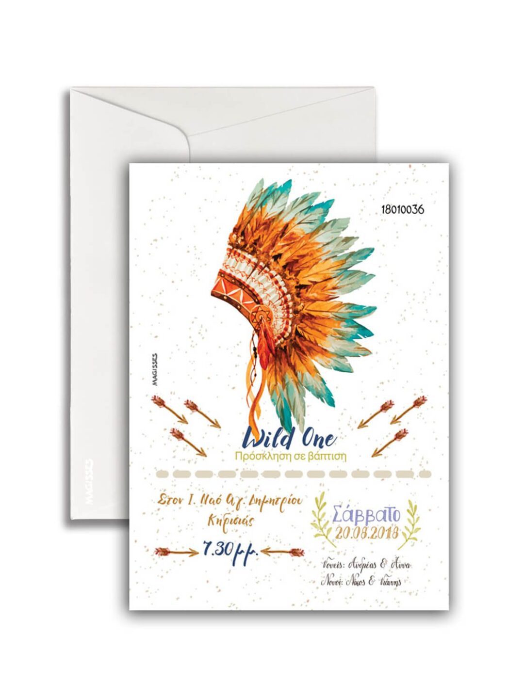 Προσκλητήριο Βάπτισης κατακόρυφο, από χαρτόνι σε χρώμα εκρού με κουκίδες μέσα, με θέμα τον Ινδιάνο. Αποτελείται από τετράγωνο οριζόντιο φάκελο σε χρώμα εκρού με διαστάσεις 13×18 cm. Τα χρώματα εκτύπωσης και τα γραφικά, μπορούν να τροποποιηθούν κατ επιλογή του πελάτη.