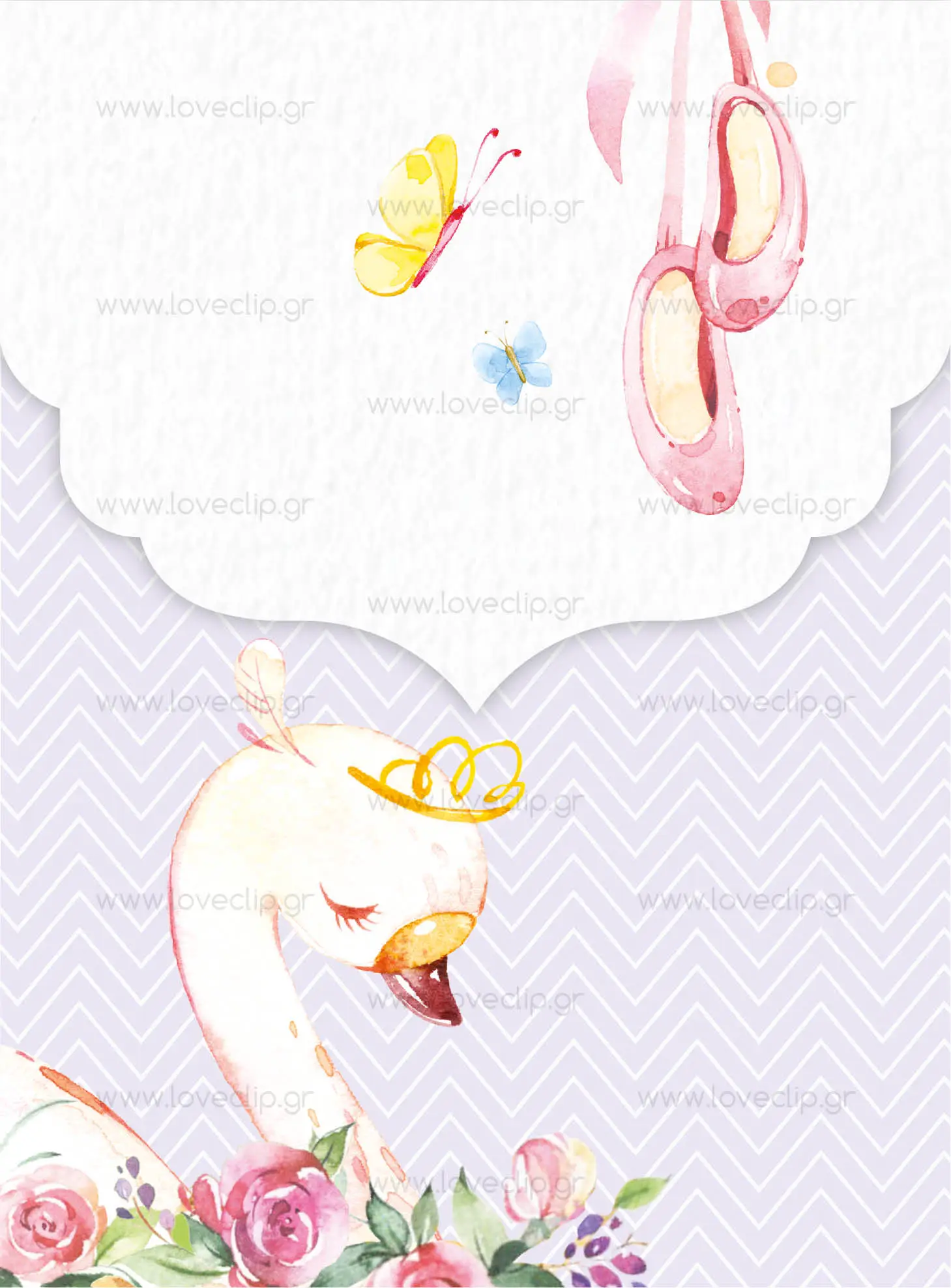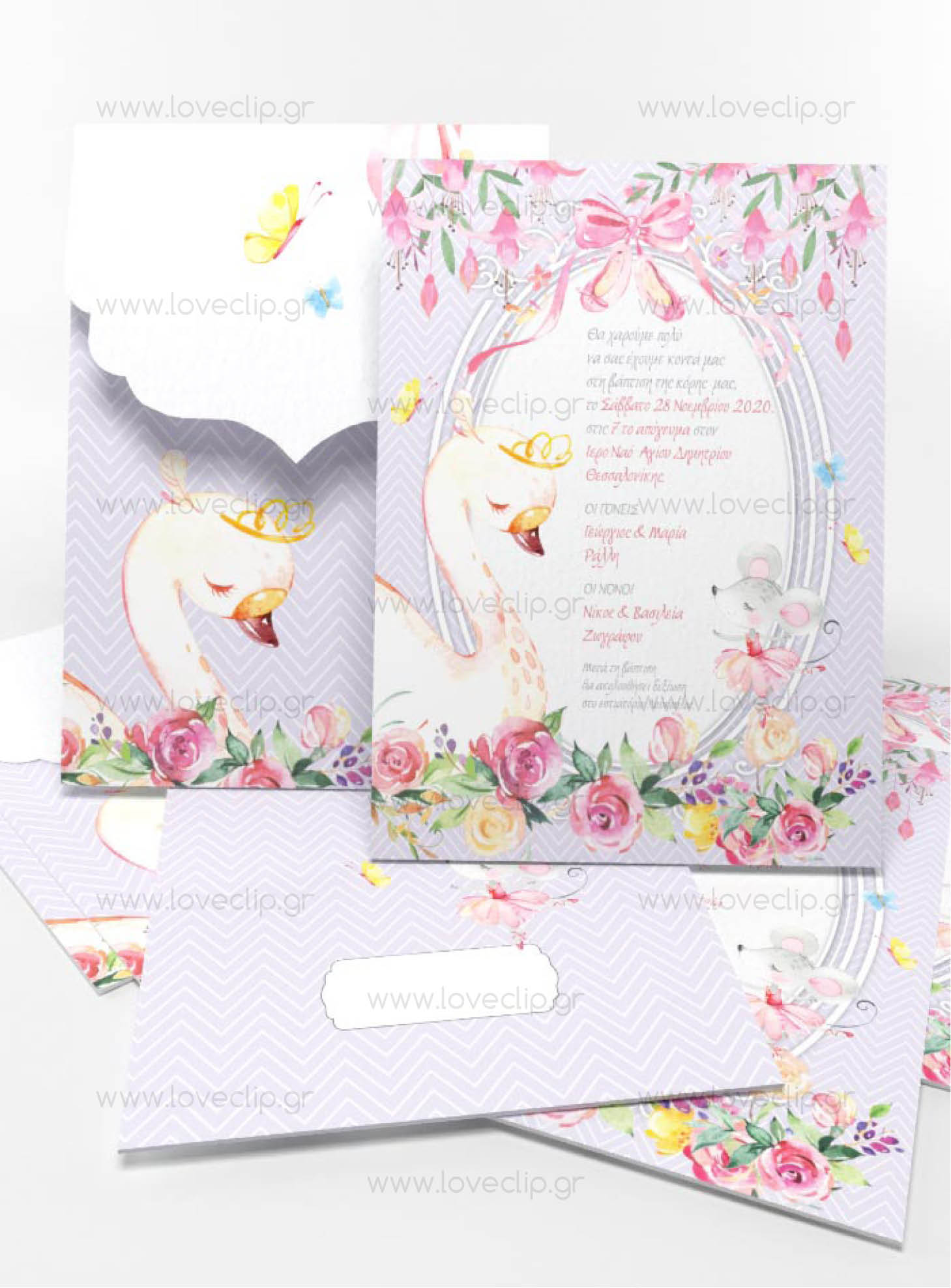 Προσκλητήριο με θέμα το κλασσικό μπαλέτο “η λίμνη των κύκνων”, με τον κύκνο σε ρομαντικό φλοράλ περιβάλλον.