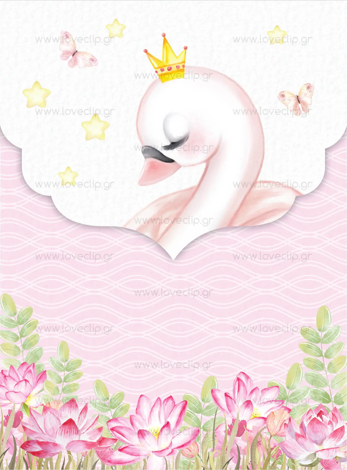Προσκλητήριο με θέμα τον κύκνο, νούφαρα, κορώνα και φλοράλ διακόσμηση..