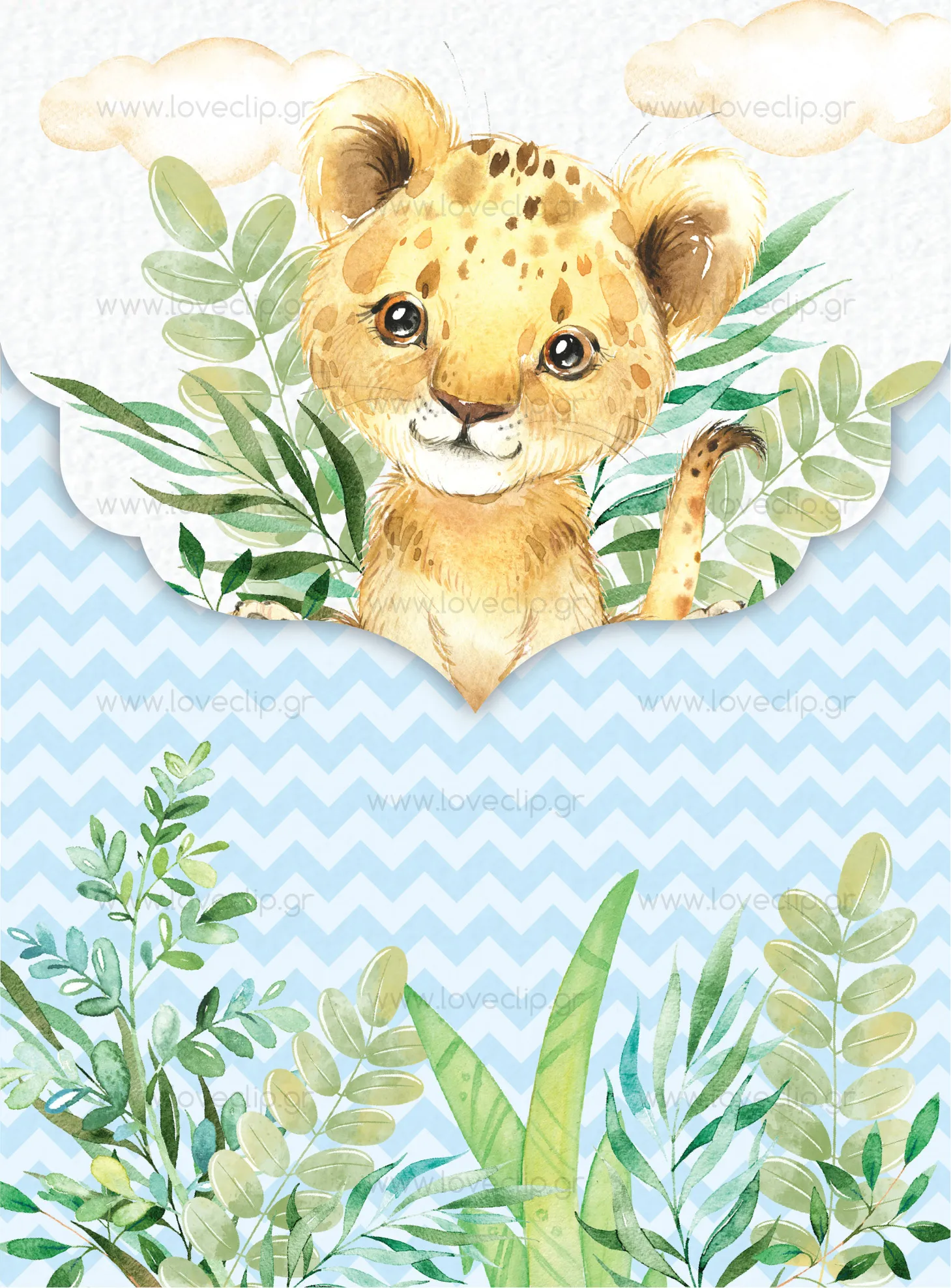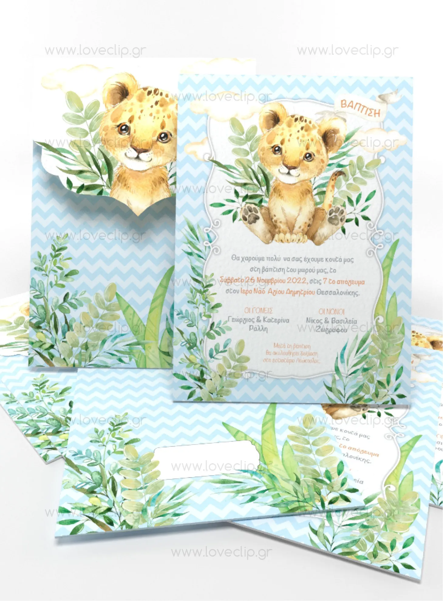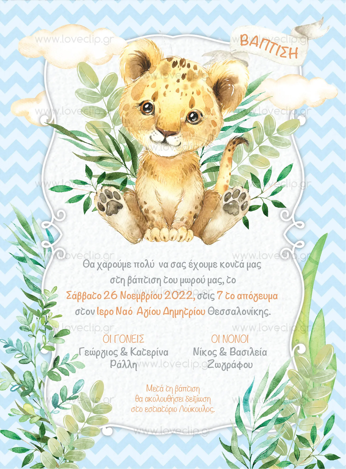 Προσκλητήριο βάπτισης αγόρι με θέμα το μικρό λιονταράκι (με ή χωρίς κορώνα).
