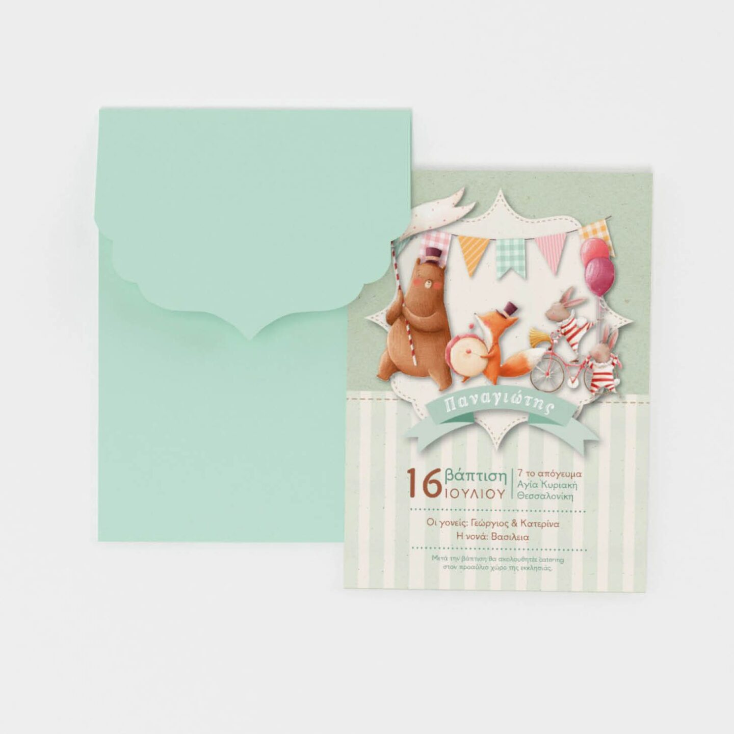 Προσκλητήριο µονόκαρτο διάστασης 11,5χ16,5 εκ. µε εκτύπωση μονής όψης σε οικολογικό χαρτί 300gr, είναι μέρος της Θεματικής Βάπτισης. Συνοδεύεται από χρωματιστό φάκελο σε οικολογικό χαρτί 250gr σε ένα από τα χρώματα επιλογής. Το προϊόν παραδίδεται έτοιμο για επεξεργασία και στολισμό (δεν συμπεριλαμβάνονται τα υλικά διακόσμησης π.χ κορδελίτσα). Το εικονιζόμενο εικαστικό, καθώς και τα χρώματα είναι ενδεικτικά.