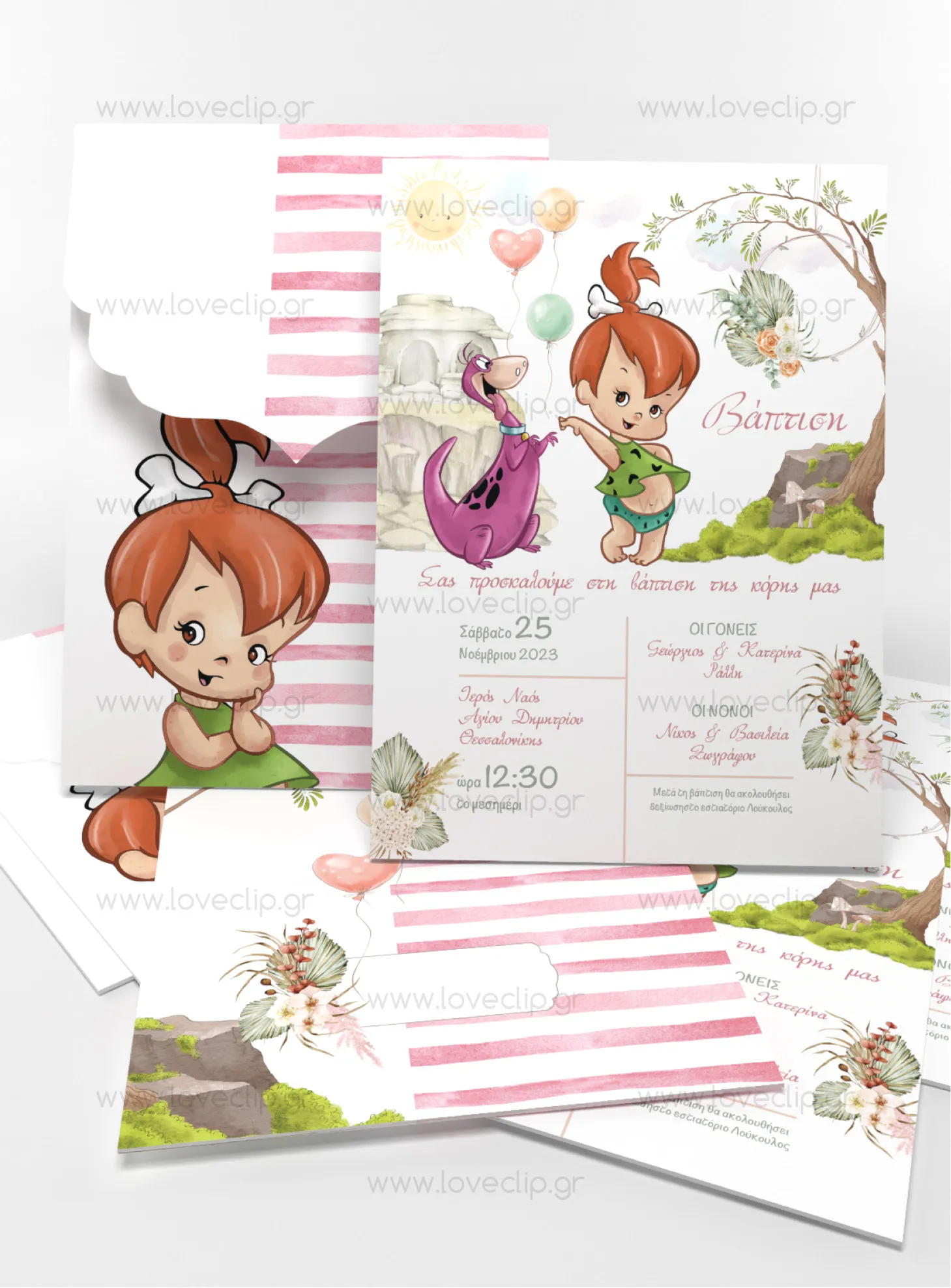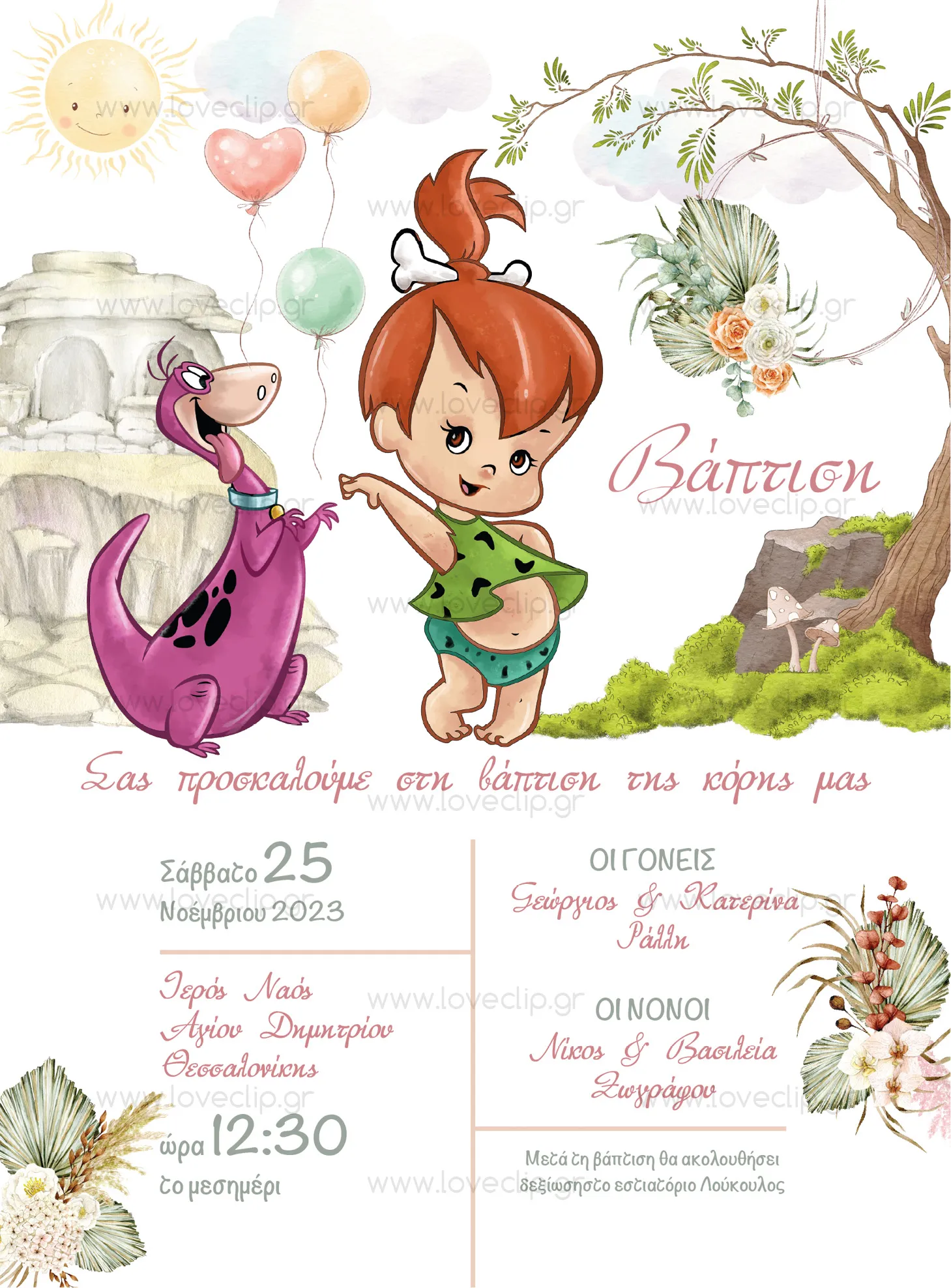 Σας παρουσιάζουμε τη Σταλίτσα – ένα φανταστικό σχέδιο που θα κάνει την ιδιαίτερη μέρα του κοριτσιού σας ακόμα πιο αξέχαστη! Εμπνευσμένη από το αγαπημένο καρτούν Flintstones, αυτή η πρόσκληση διαθέτει ζωντανά χρώματα και υπέροχο σχεδιασμό.
