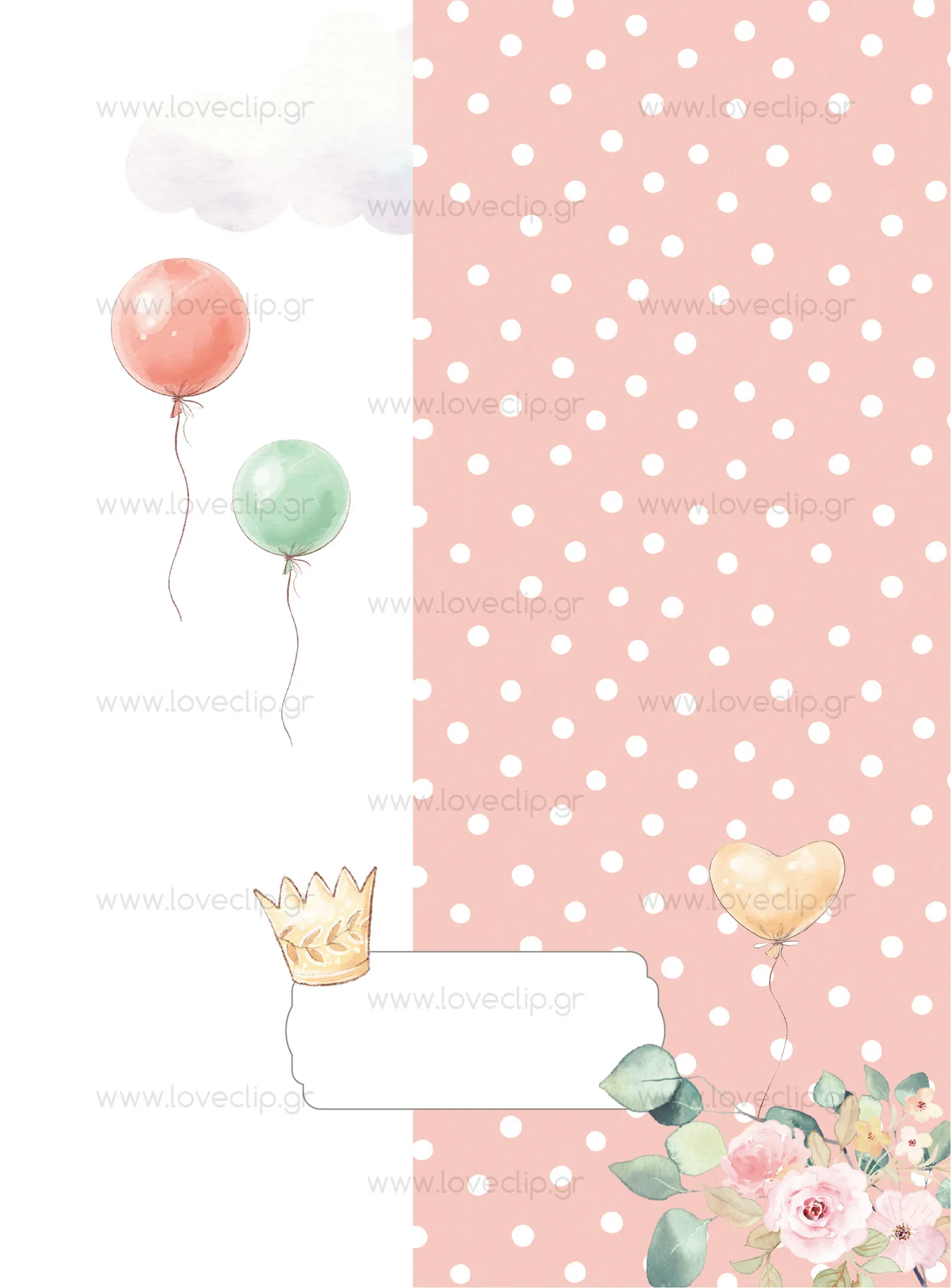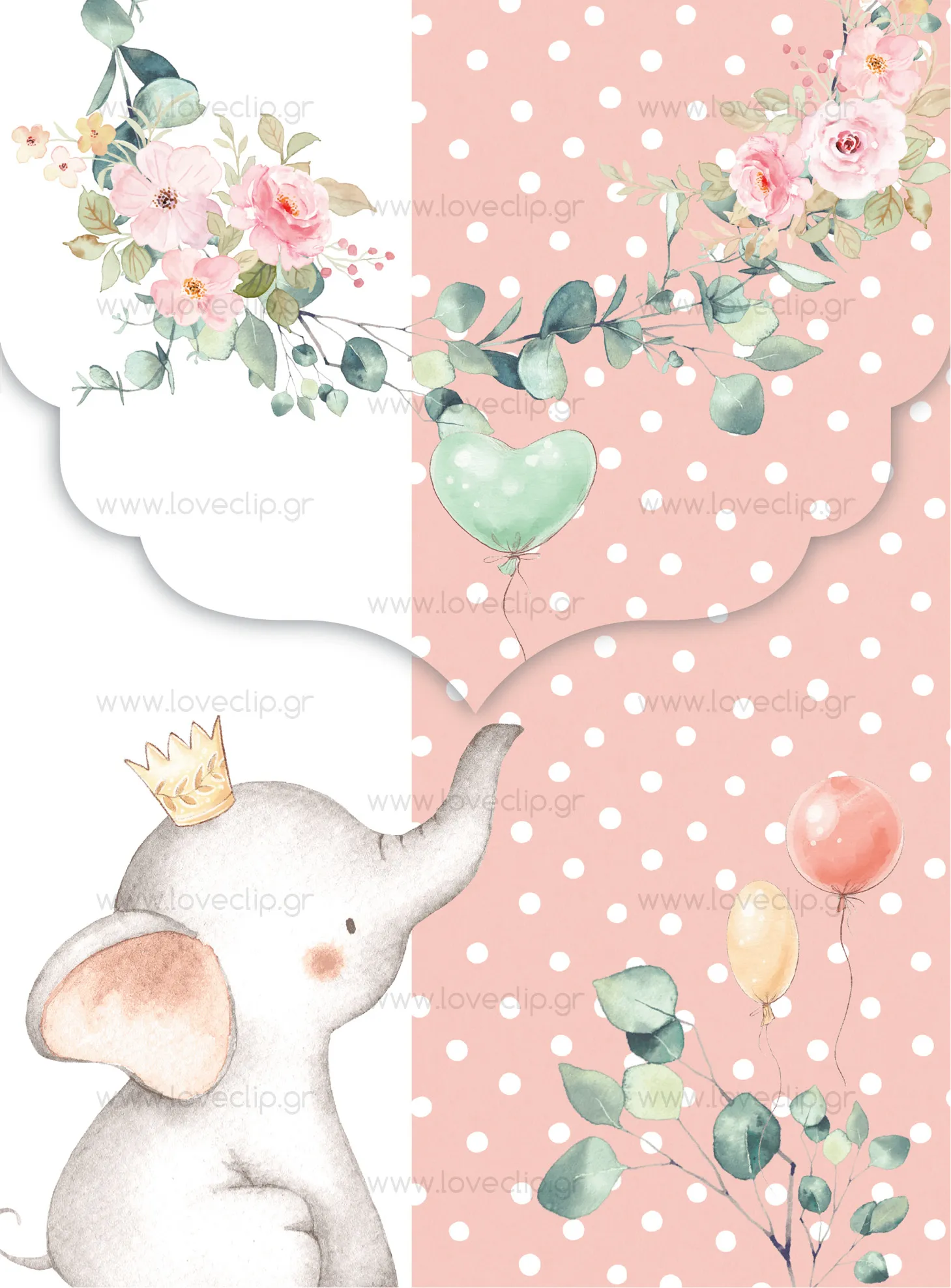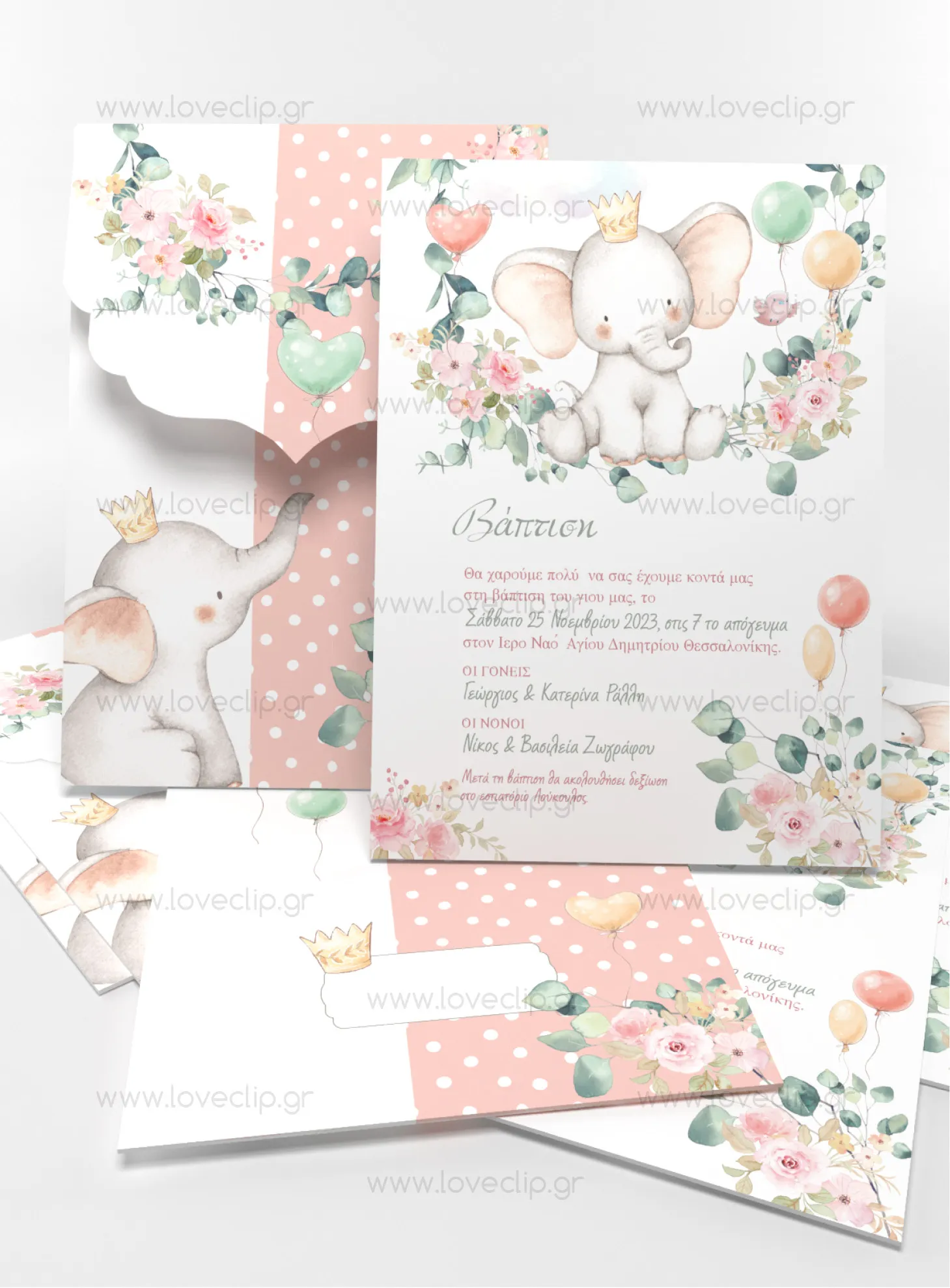 Σας παρουσιάζουμε την αξιολάτρευτη πρόσκληση για κορίτσι της βάπτισης Princess Elephant! Με το χαριτωμένο σχέδιο και τα boho χρώματα του, είναι βέβαιο ότι θα τραβήξει την προσοχή όλων. Με υπέροχα τριαντάφυλλα και ιδιαίτερα μπαλόνια, αυτή η πρόσκληση δίνει τον τόνο για μια χαρούμενη γιορτή.