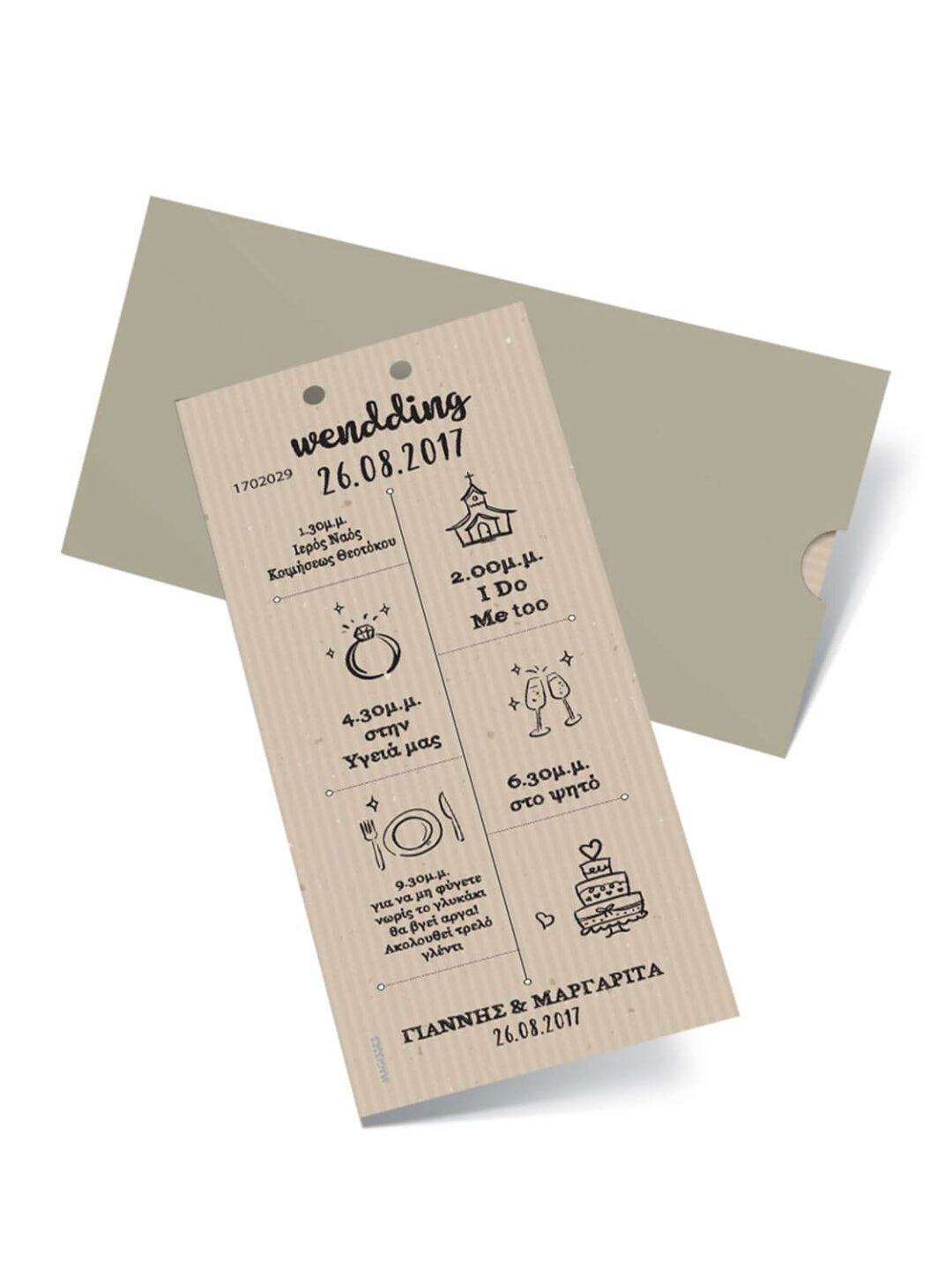 Προσκλητήριο γάμου κατακόρυφο, από χαρτόνι σε καφέ χρώμα, με σκίτσο και περιγραφή από το γάμο και τη δεξίωση. Αποτελείται από κατακόρυφο, συρταρωτό καφέ μεταλιζέ φάκελο με διαστάσεις 7,5×20 cm. Τα χρώματα εκτύπωσης και τα γραφικά, μπορούν να τροποποιηθούν κατ επιλογή του πελάτη.