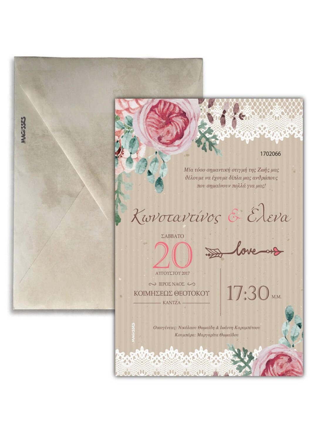 Προσκλητήριο γάμου ορθογώνιο κατακόρυφο σε καφέ/μπέζ χαρτόνι, vintage, με λουλούδια και μοντέρνα γραφή. Αποτελείται από ορθογώνιο μπεζ που κάνει μέσα νερά φάκελο 12×18 cm. Τα χρώματα εκτύπωσης και τα γραφικά, μπορούν να τροποποιηθούν κατ επιλογή του πελάτη.