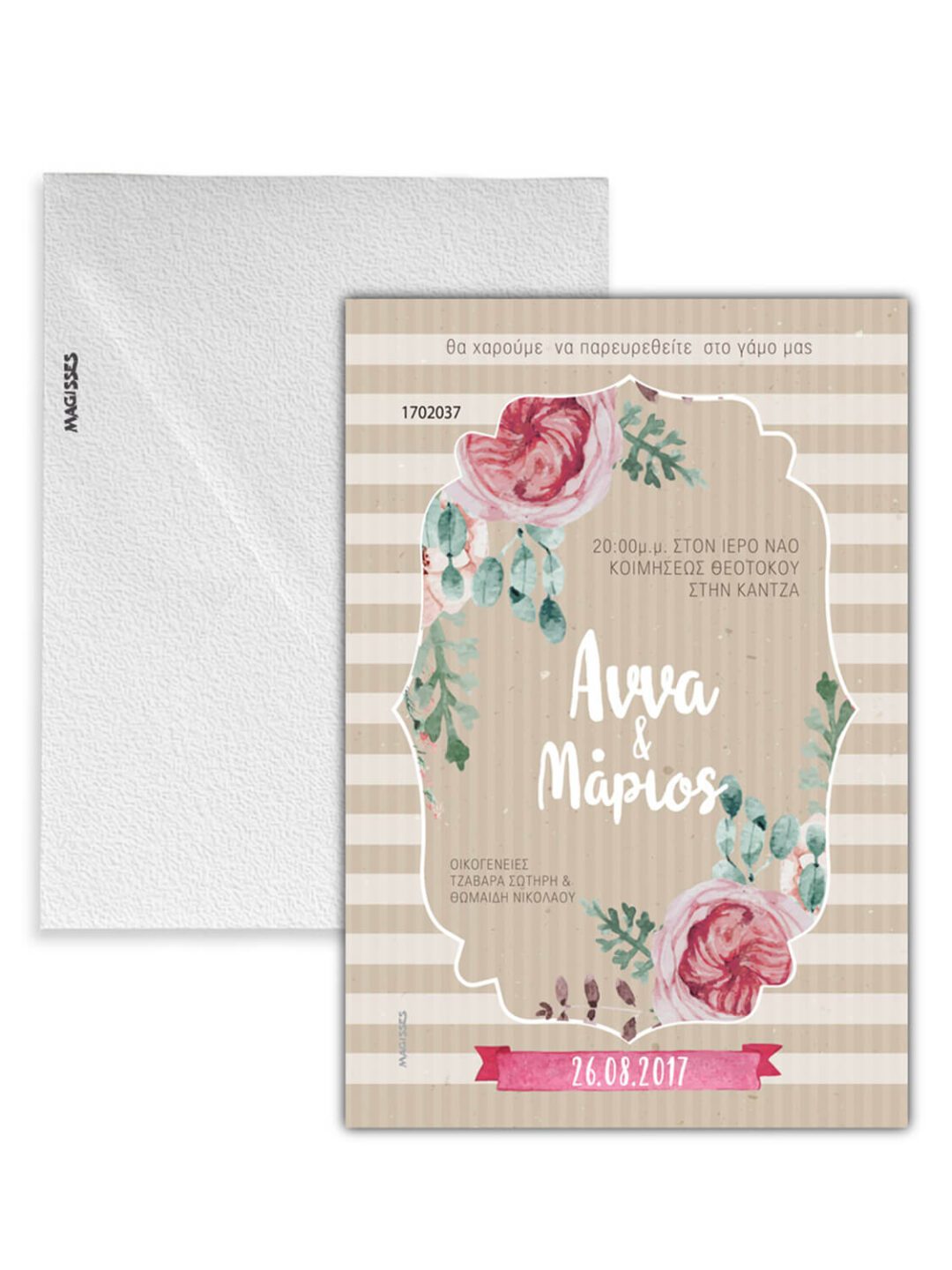 Προσκλητήριο γάμου ορθογώνιο κατακόρυφο σε μπεζ/καφέ ριγιέ χρώμα με θέμα έντονα λουλούδια και στην μέση τα ονόματα. Αποτελείται από ορθογώνιο κατακόρυφο φάκελο με διαστάσεις 12×18 cm, από χαρτόνι σαγρέ σε εκρού χρώμα.Τα χρώματα εκτύπωσης και τα γραφικά, μπορούν να τροποποιηθούν κατ επιλογή του πελάτη.